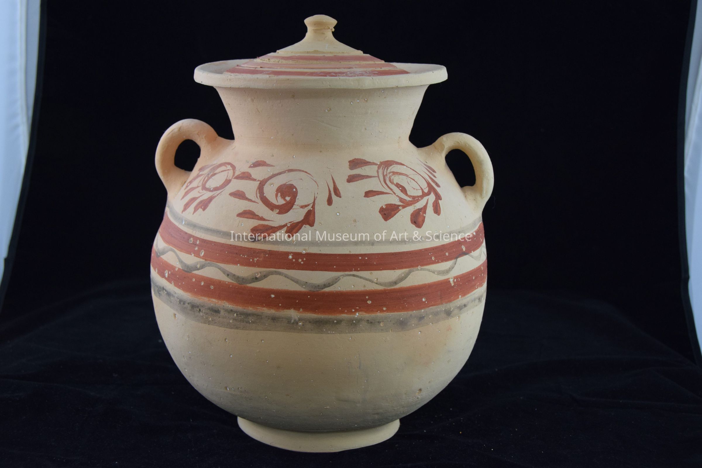 Pot With Lid. Tula, Tamaulipas. Domingo or Jose Herrera Robles. Clay. c.1990. Natural Light Orange Pot and Lid; Pot has Spherical Body and Two Small Handles; Lid has Small Handle at Center top; Both Decorated with red-orange Bands.Made/Created