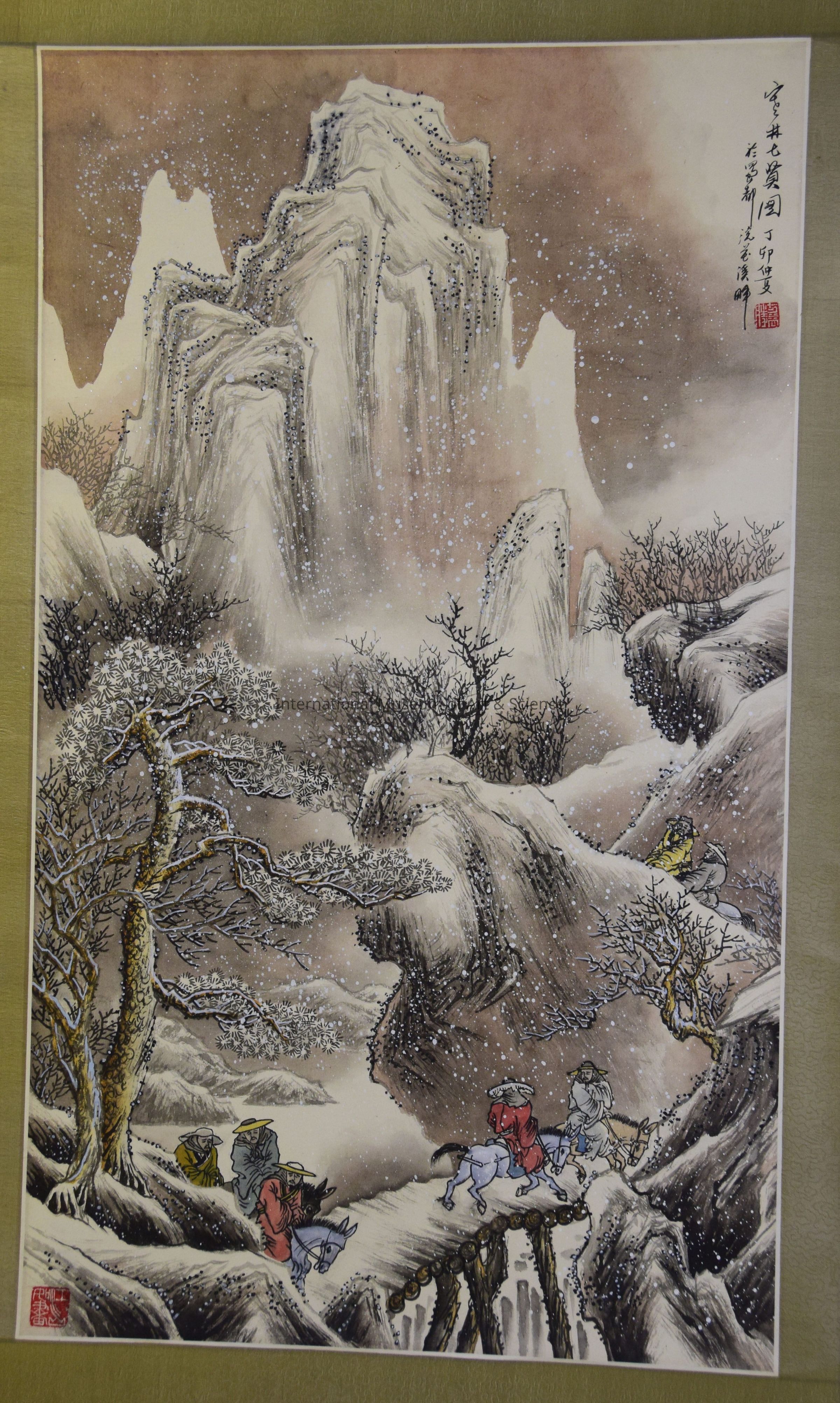 A Japanese scroll print. The image on the scroll shows a snowy mountain scene, with me riding horseback over a bridge along a mountain trail. The nature in the scene is depicted in white, tan, and black, while the riders on horseback are shown in bright colors like red and blue.