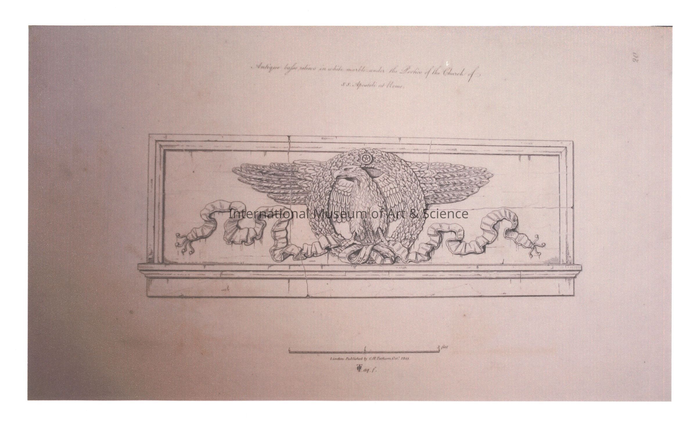 An Italian architectural print. The print shows a detailed drawing of a frieze depicting an eagle in a wreath. The description above the image reads: "Antique basso relievo in white marble under the portico of the Church of A.A. Apostoli at Rome."Dimensions