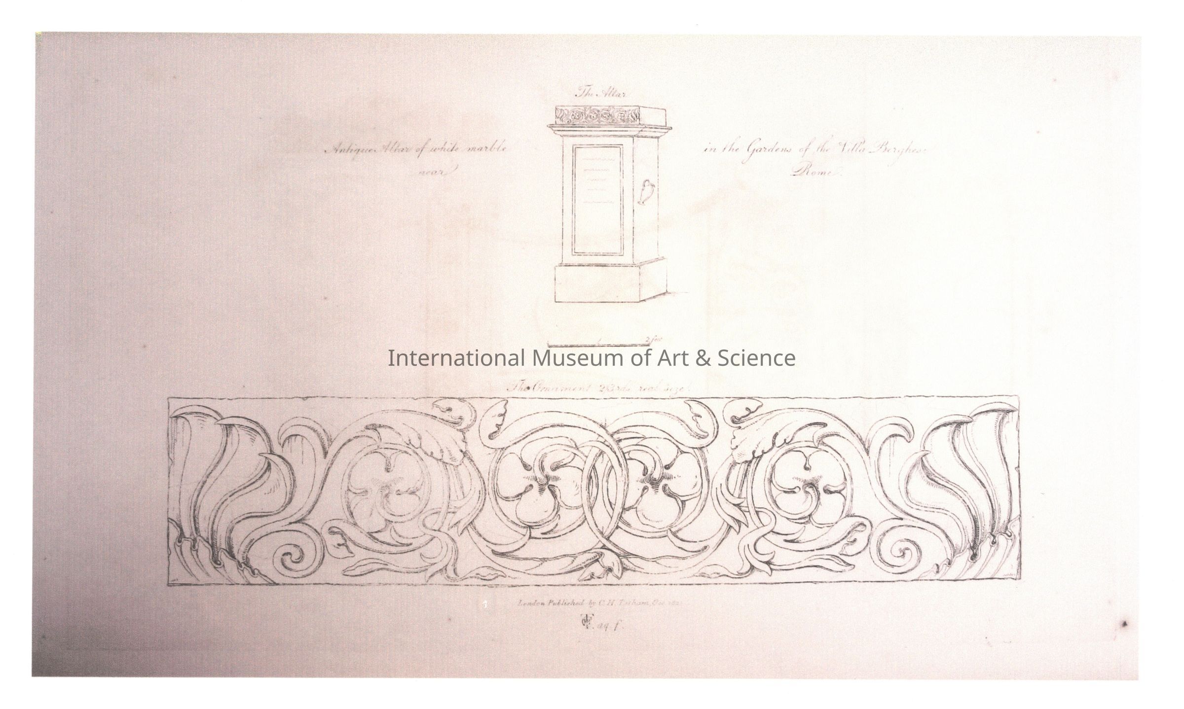 An Italian architectural print. The print shows details on an altar piece. The description above the image reads: "Antique altar of white marble in the Gardens of the Villa Borghese, Rome. The ornament 2/3rds real size."Dimensions