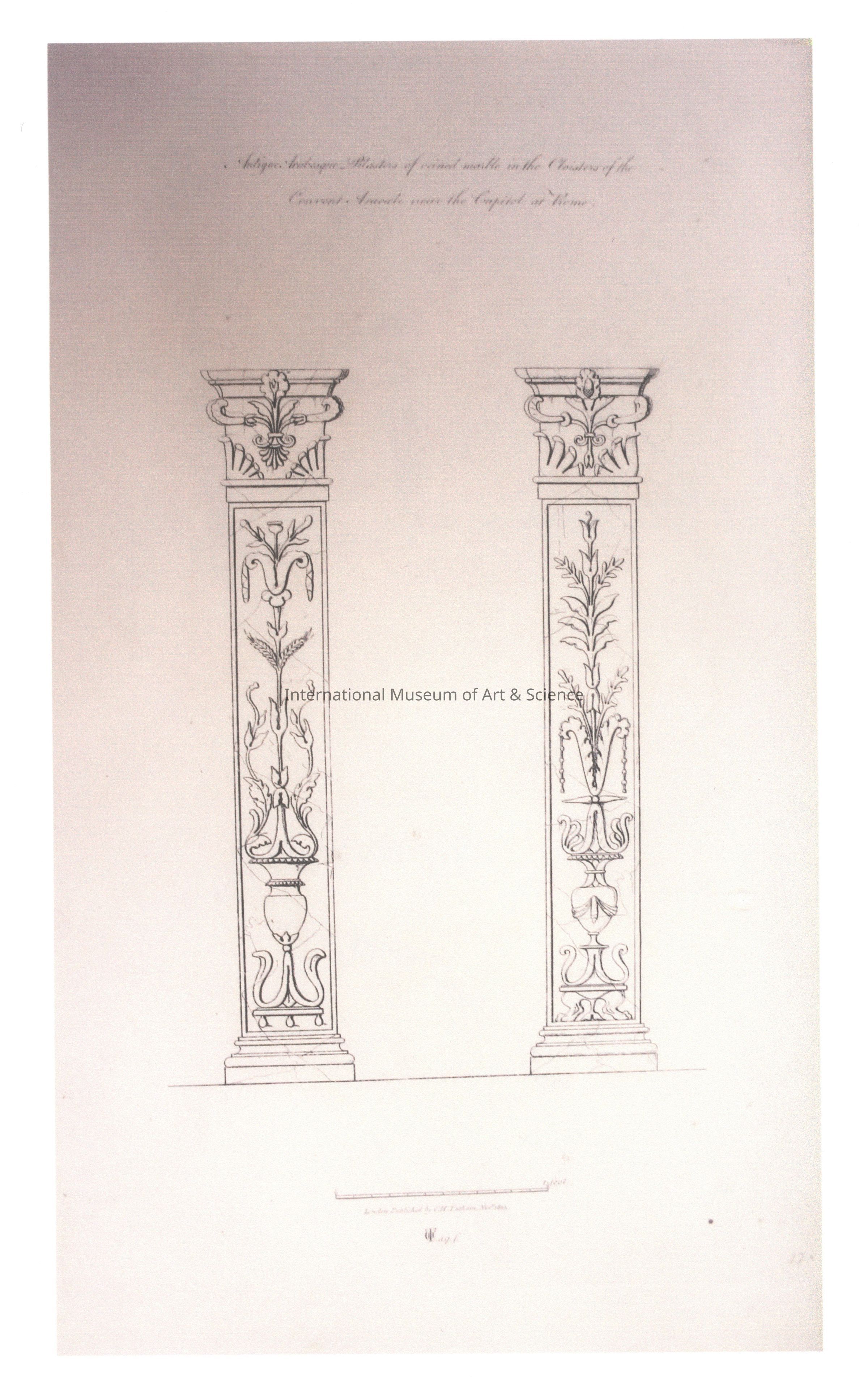 An Italian architectural print. The print shows a two columns in detail. The description above the image reads: "Antique Arabesque pilasters of veined marble in the Cloisters of the Convent Aracaeli near the Capitol at Rome."Dimensions