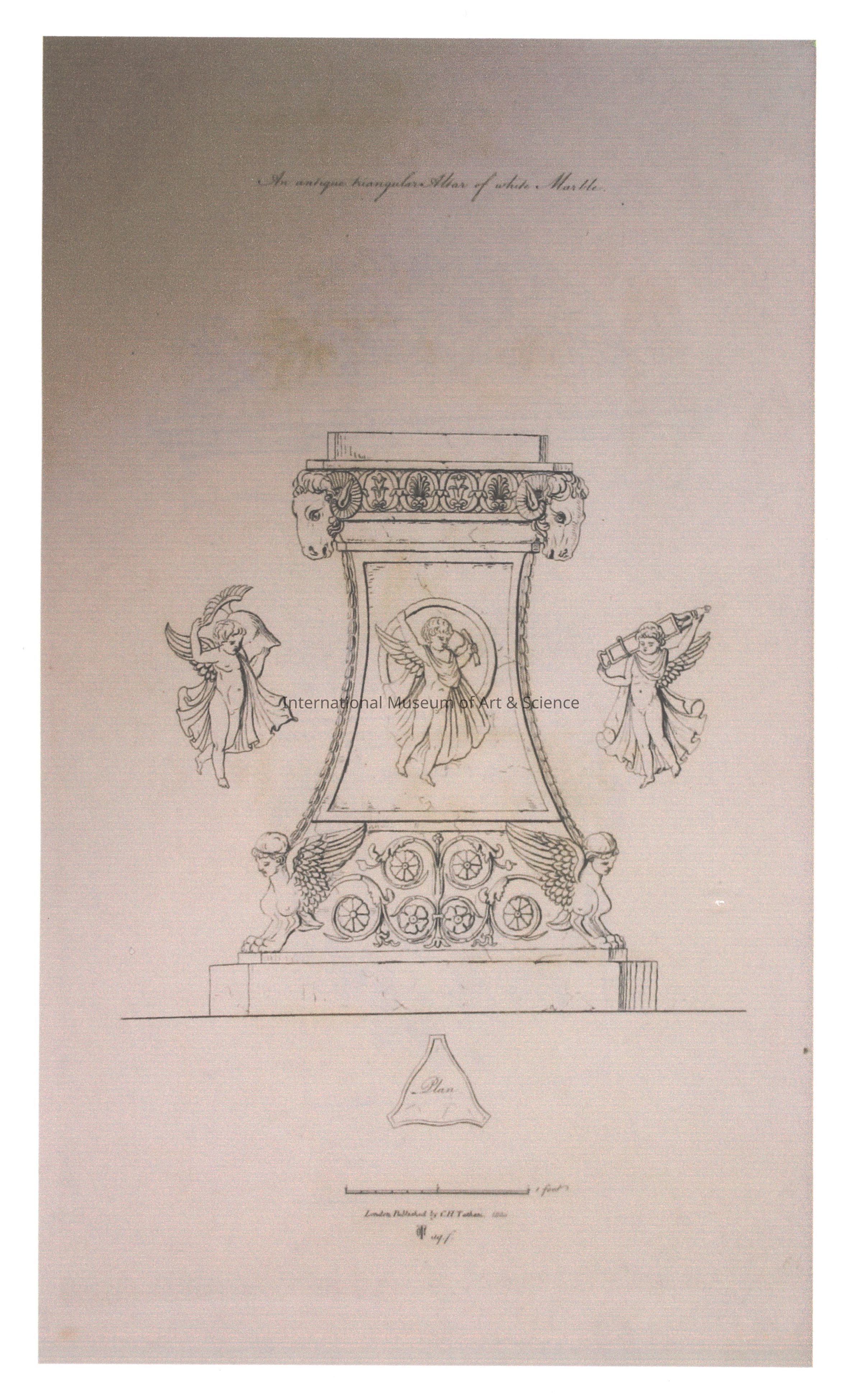 An Italian architectural print. The print shows details on an altar piece. The description above the image reads: "An antique triangular altar of white marble." The sides of the altar are shown to be adorned in fireze reliefs of angels, floral motifs, and goat heads.Dimensions
