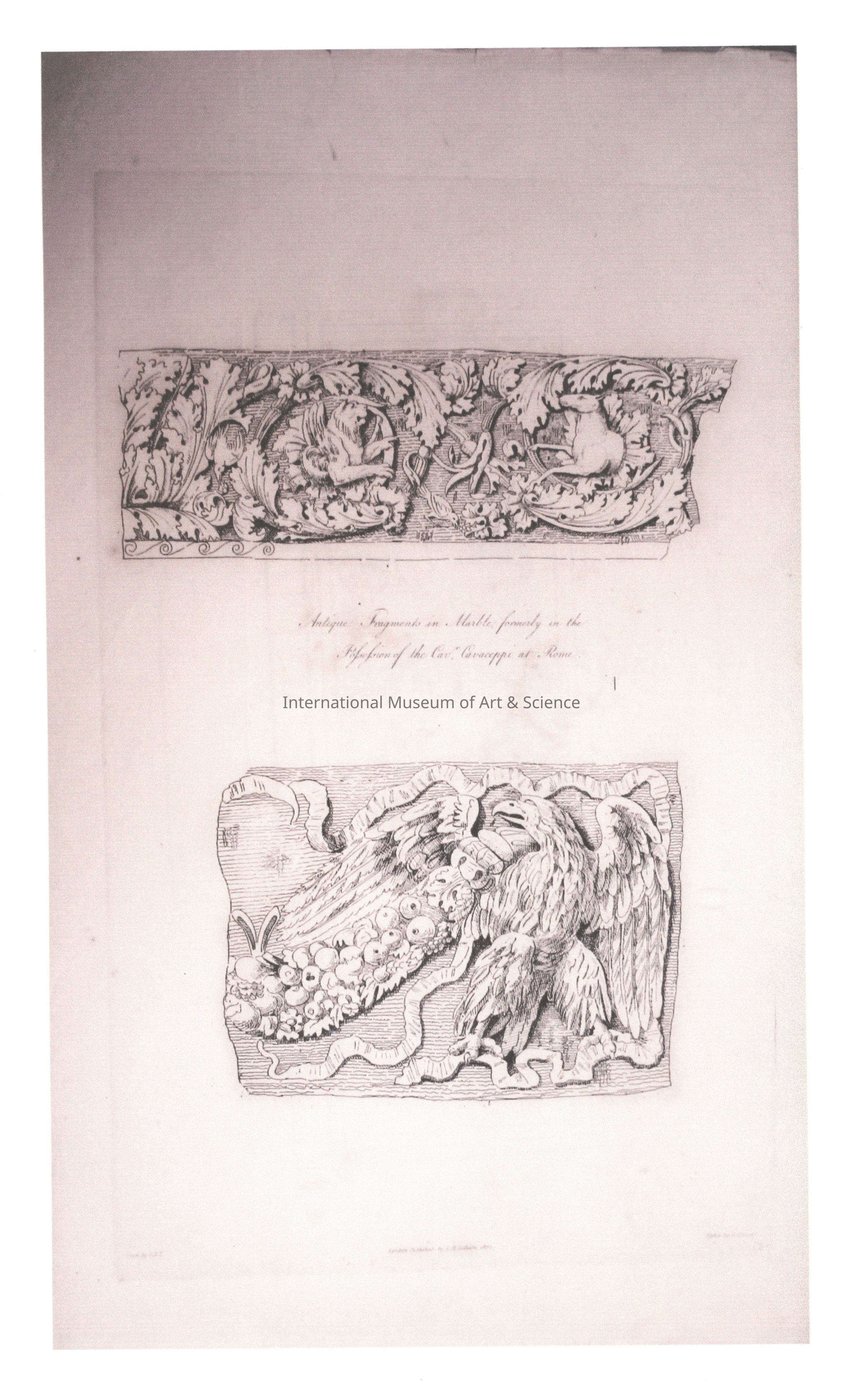 An Italian architectural print. The print shows details of two frieze details One showing a floral motif and the other an eagle. The description above the image reads: "Antique fragments in marble formerly in the Possession of the Cav Cavaceppi at Rome."Dimensions