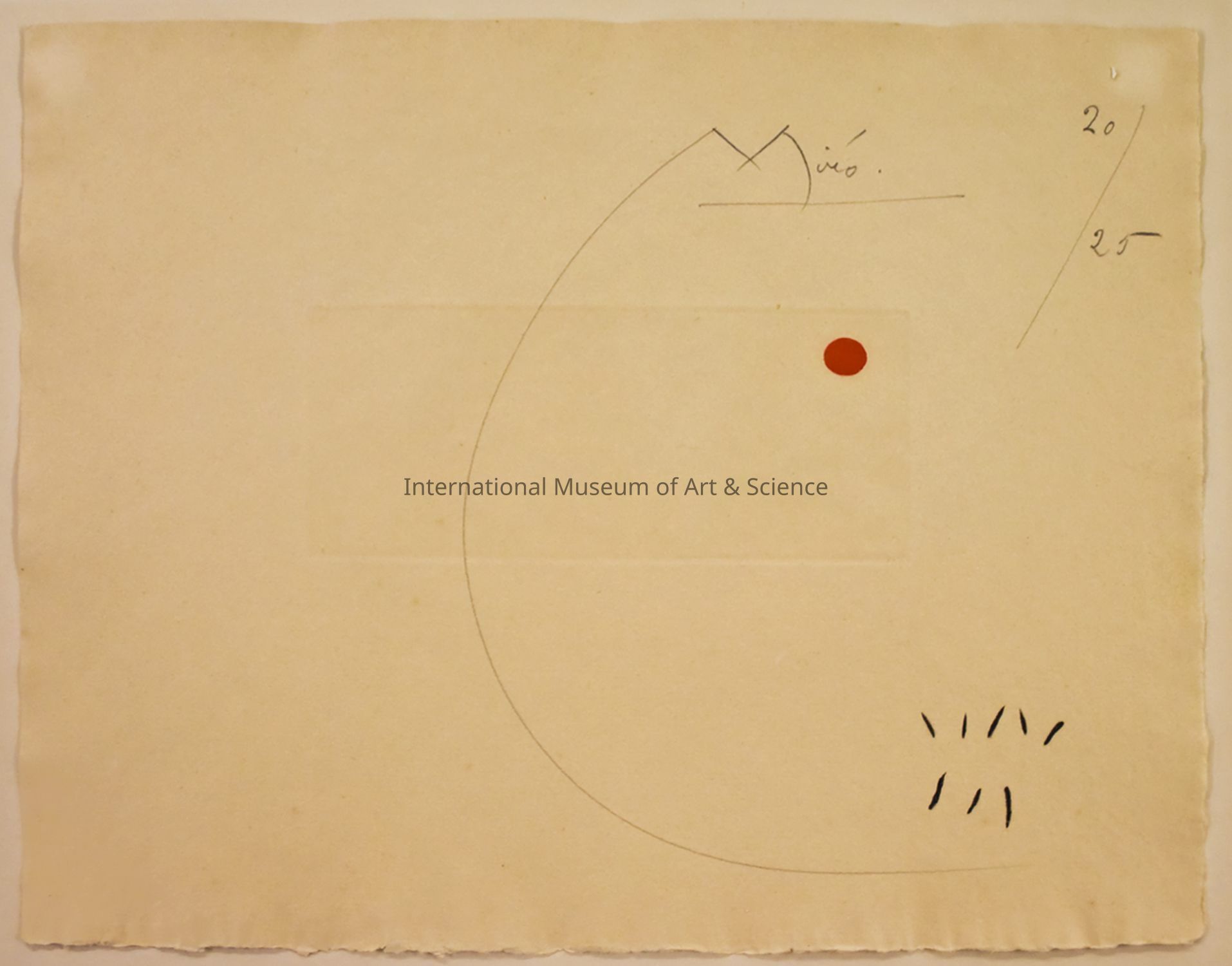 A print titled "Proof Plate VIII from the suite "Sans le soleil" or "Without Sun" by Joan Miró i Ferrà. It is an Embosed rectangle, small red circle and 8 lines on bottom left. Print 20/25.Dimensions