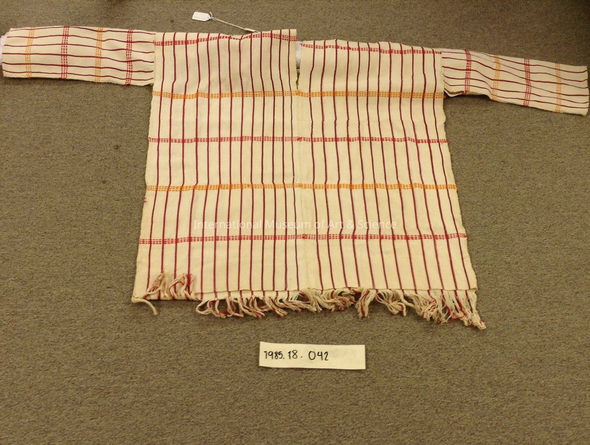 Man's shirt. Cream background on man's shirt; v-neck; red vertical stripes on body; horizontal triple lines of orange and red acrylic stitched bands; fringed.Artwork Details