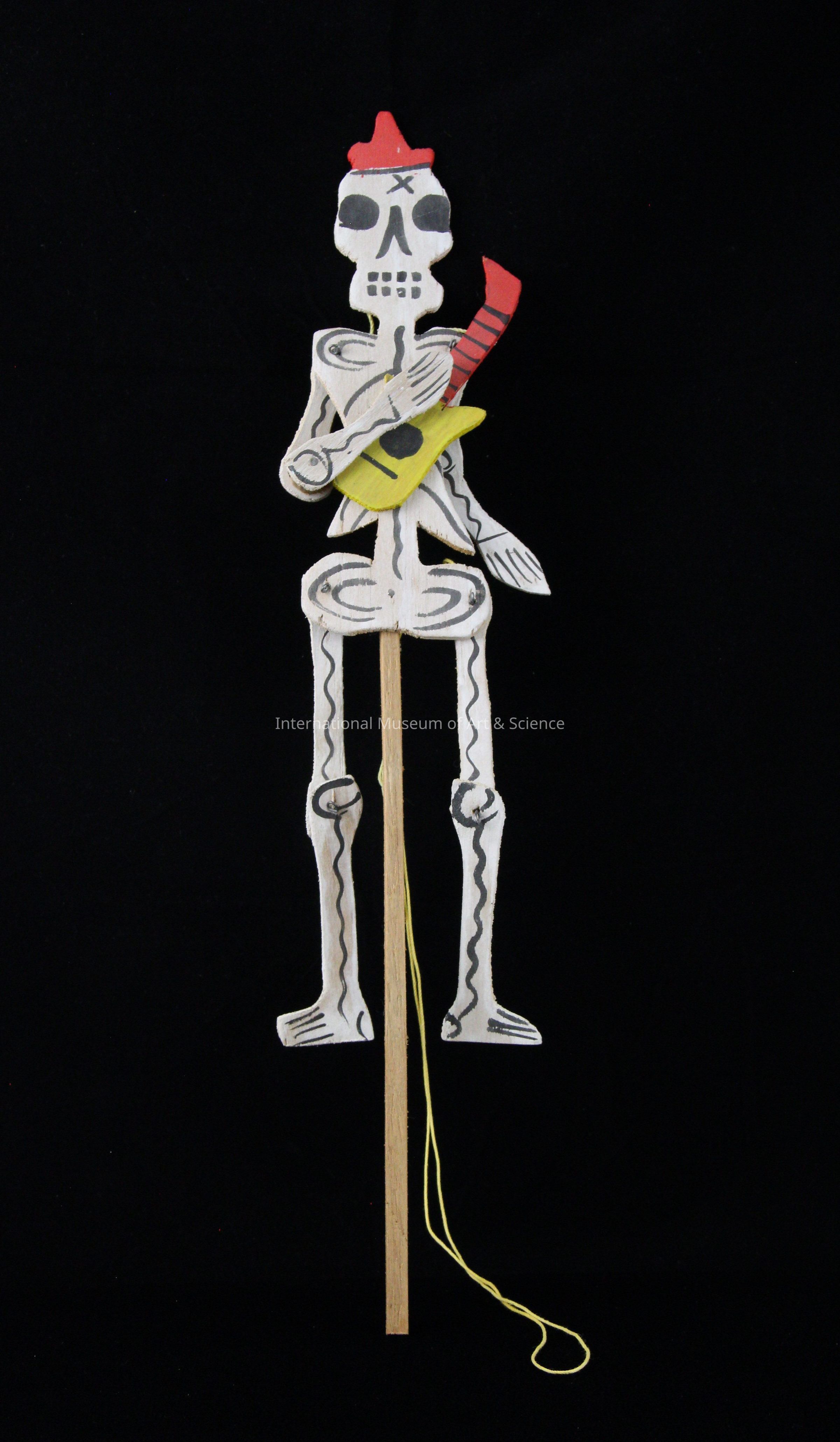 A stick puppet of a skeleton. The skeleton is holding a guitar. The piece is painted white with black, red, and yellow details.Artwork Details