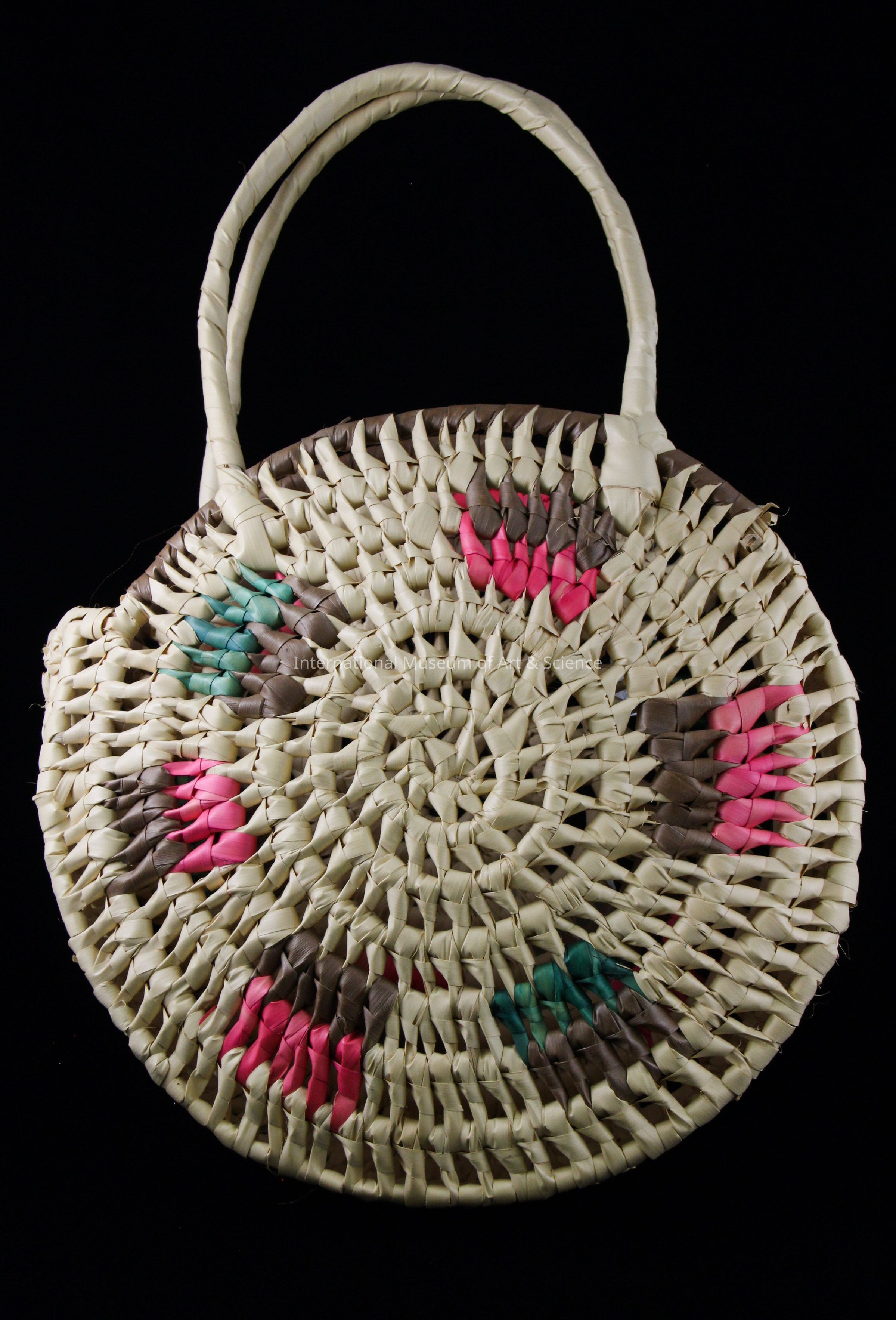 A woven purse (Yoyo). The large purse is made of natural and dyed palm leaves. The purse has two curved handles made of wrapped palm leaves, a large round body, and round rows of wrapped and woven palm leaves leaving openings. There are dyed palm leaves in separate sections of the purse in pink, red, brown, green, and rose. The majority of the purse is natural in color.Artwork Details