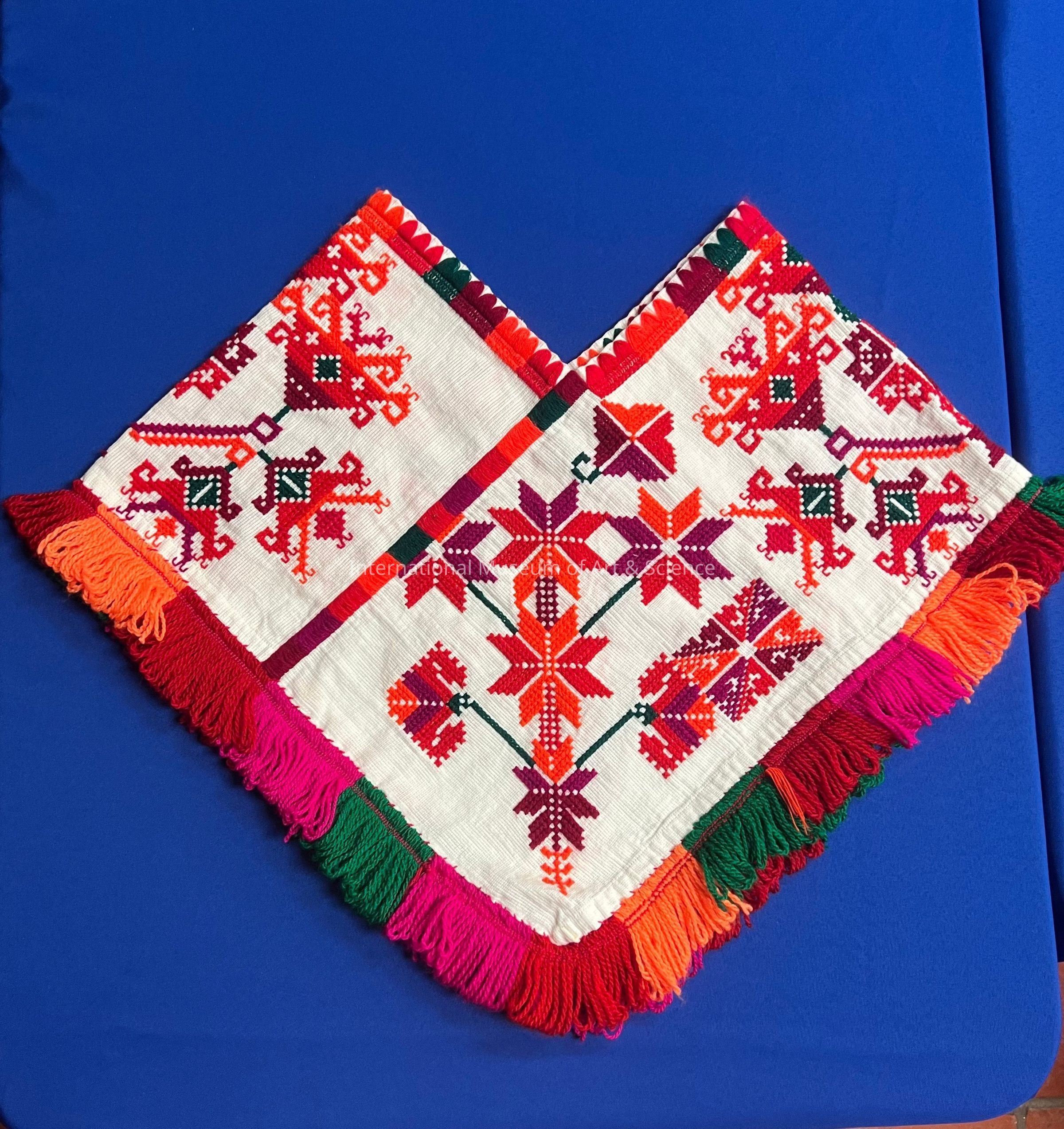 White Fabric with cross-stitch flower and animal designs in green, red, orange, violet, and maroon. Looped fringe in green, red, orange, and deep pink. Huastec culture Made by Maria Acension Hernandez Ana/ Mexico Made in Tanzumatza, (S.L.P. ?) Mexico