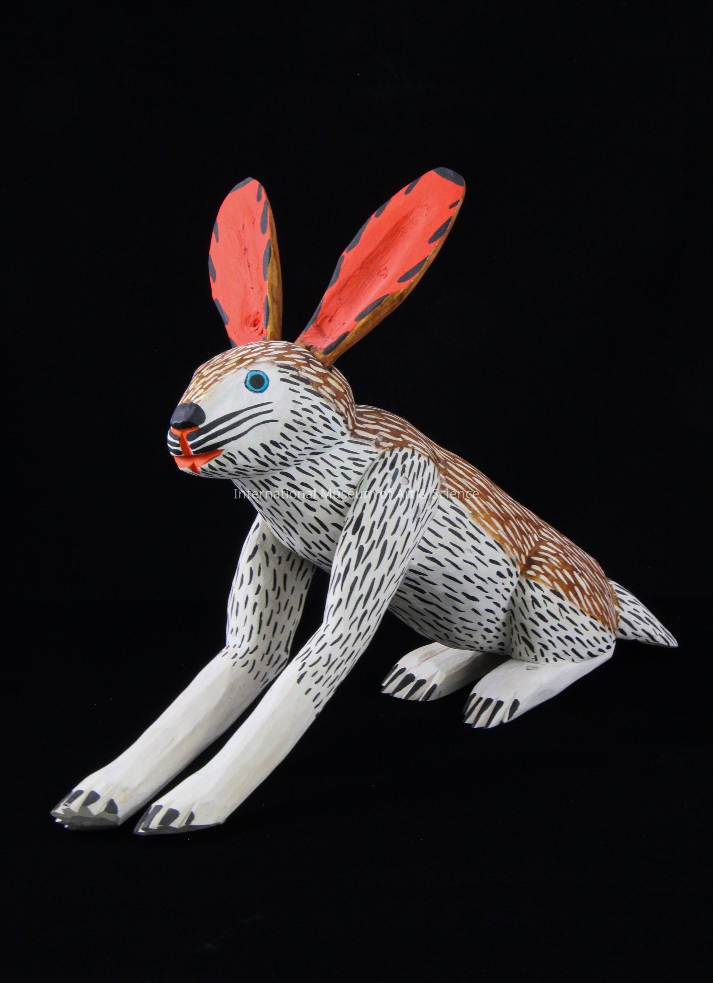 A wood carved animal figurine. The figurine depicts a sitting rabbit. The rabbit is painted with a brown back and a white underside. There are white and black strokes on the piece to create a fur texture. It has blue, orange, and black details on the face.Made/Created