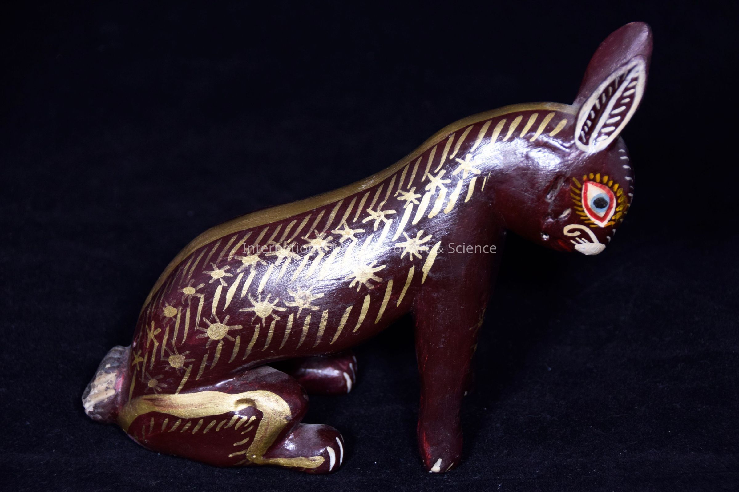 Dark brown body with gold strip on back; touches of gold stars and stripes on ears and body; sitting in hind feet; long pointed ears; short tail.Dimensions