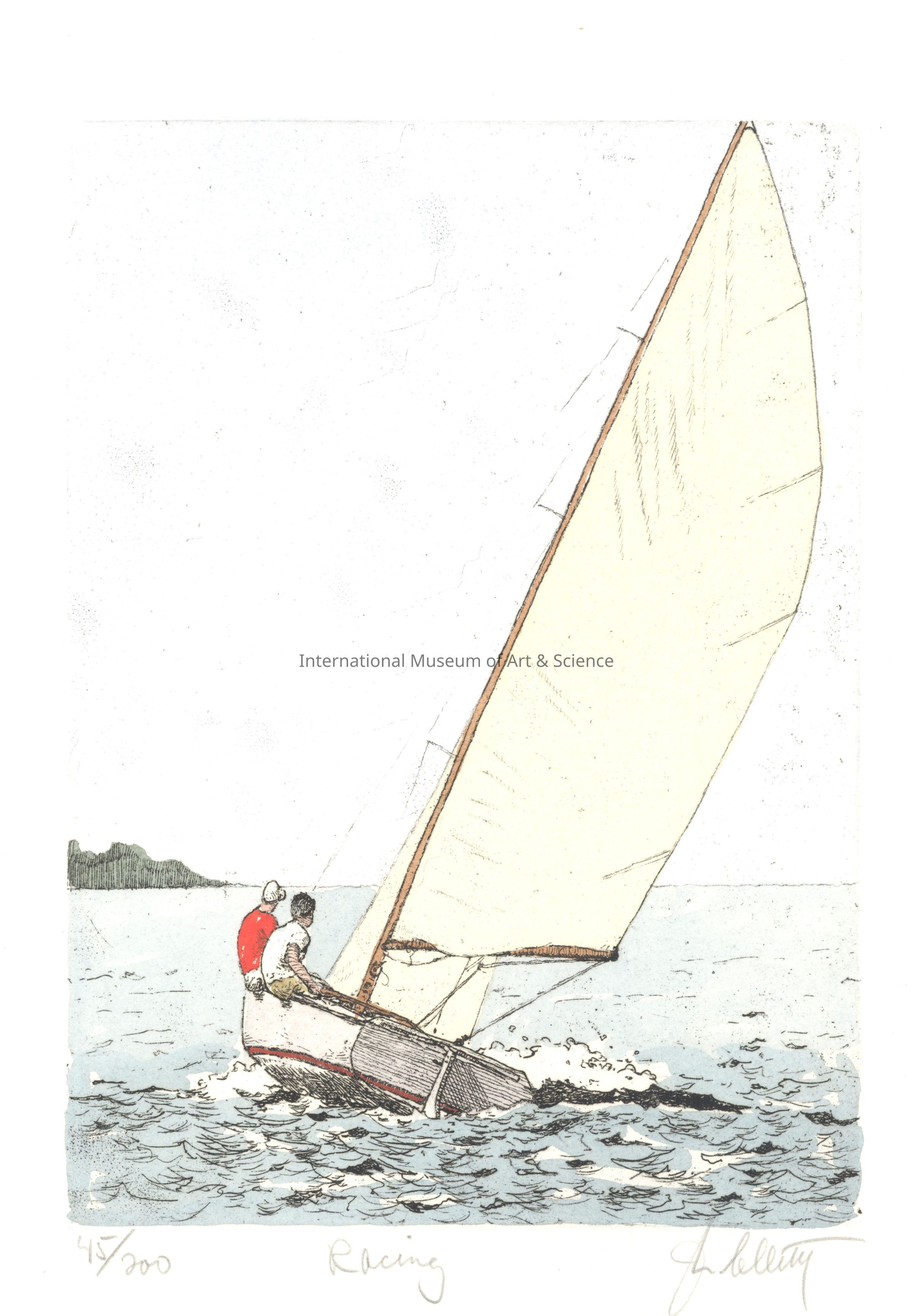"Racing" - John Collette, U.S. (1941). Original hand-colored etching, signed, #45 of edition of 200 + 20 A.P. Sail Boat scene.