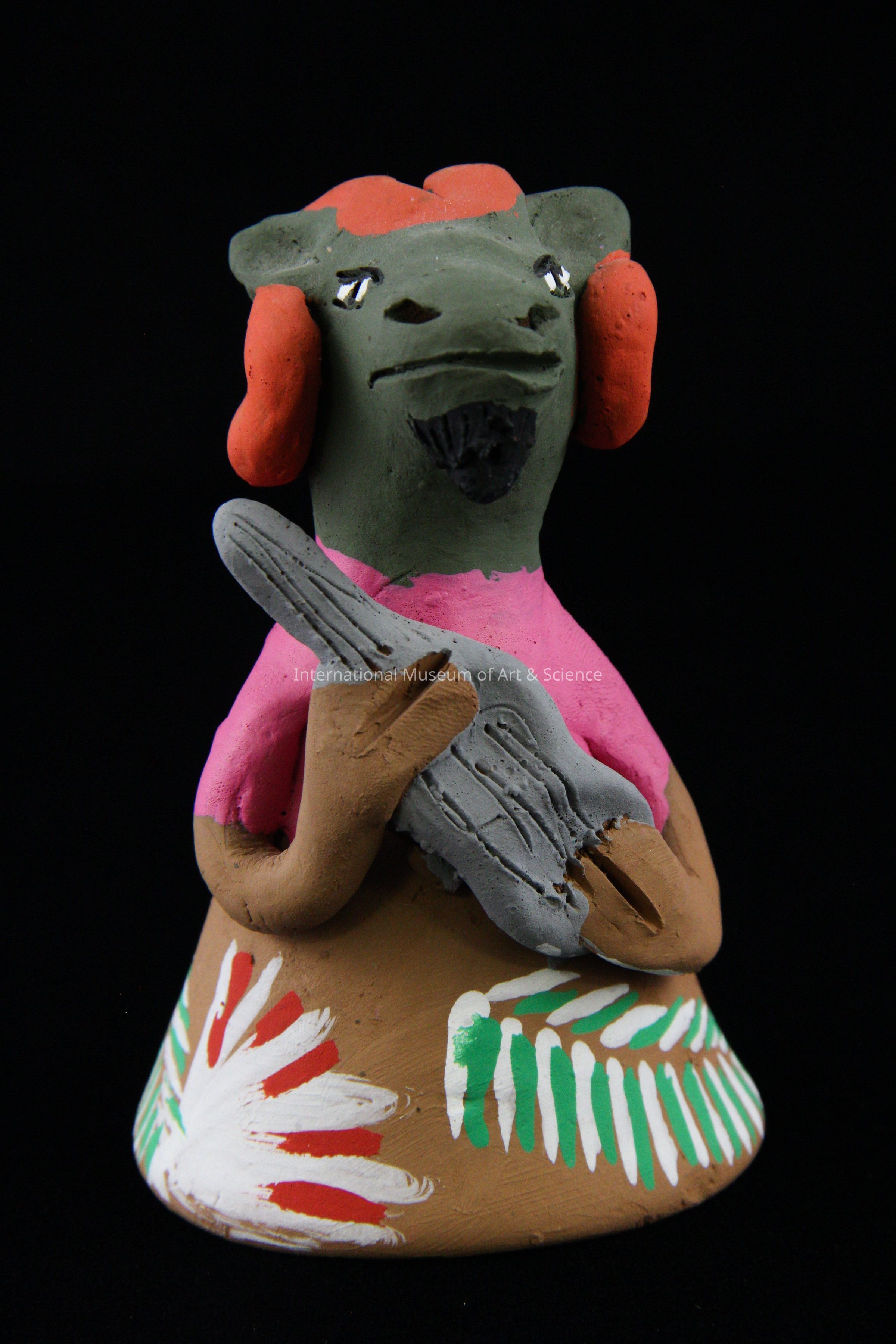 A ceramic bell in the shape of a ram. The ram has a grey/green head with red horns, and black chin whiskers. The ram is holding a grey guitar and is wearing a pink shirt. The bell shape base has floral designs on the terracotta base. The bell bead is clay and is attached to the inside of the bell with yellow string.Dimensions