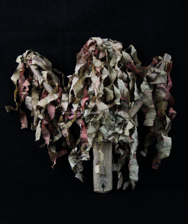 A Metachin hand shaker. The shaker has a wide wooden handle with two pieces of wood that branch off, giving it a forked look. The forks are decorated in faded crepe paper streamers.Dimensions