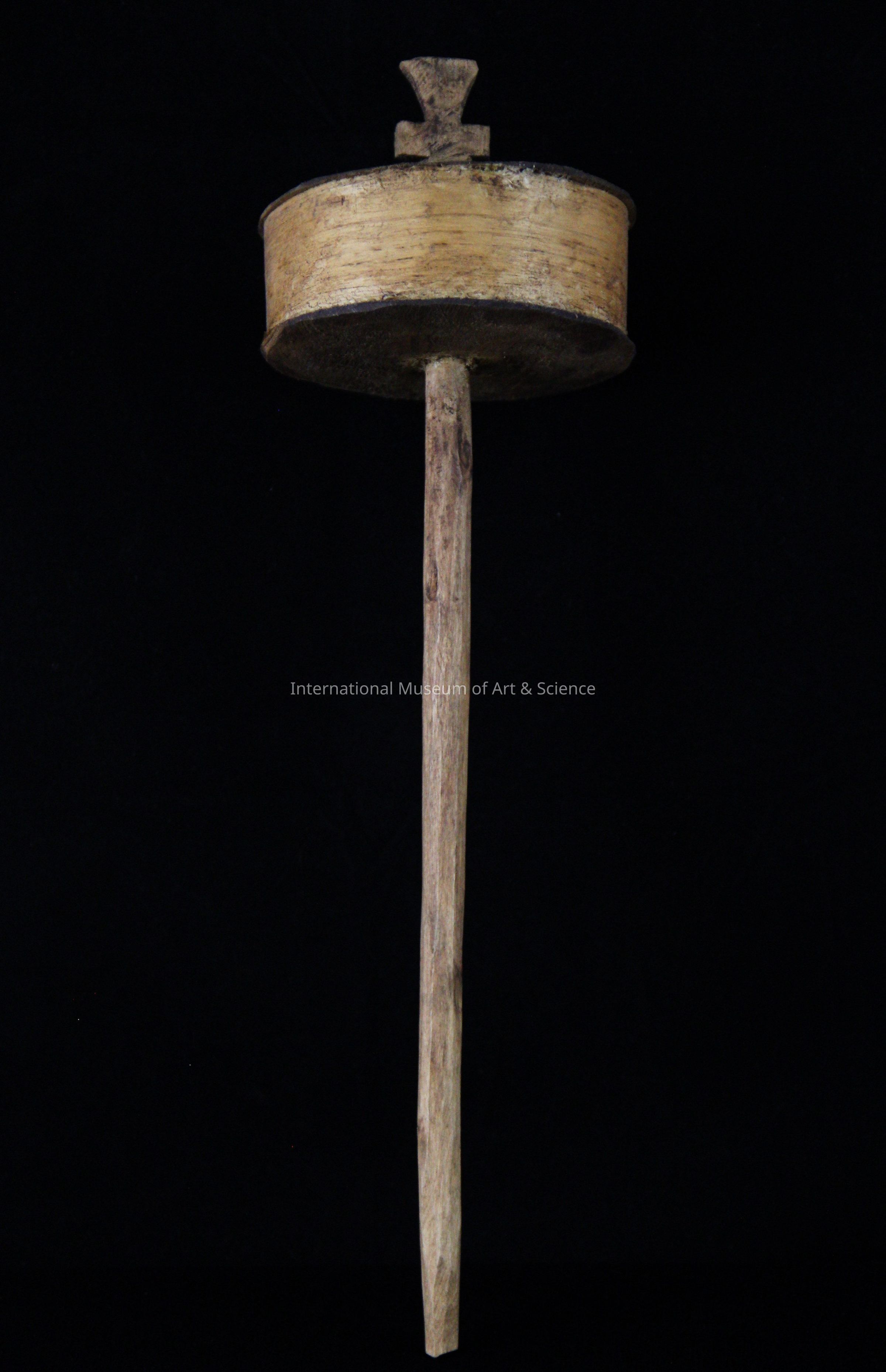 A rattle. The rattle has a wooden handle with a round wooden canister area as the rattle. The top of the canister is decorated with a carved wooden cross.Dimensions