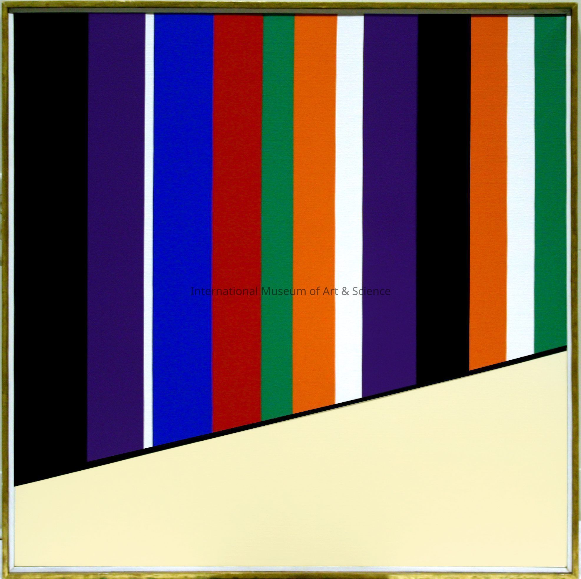 "Rayas Tropicales" Hard edge style; painting with a large beige wedge at bottom and vertical stripes at top in black, purple, white, blue, green, red, & orange.Dimensions