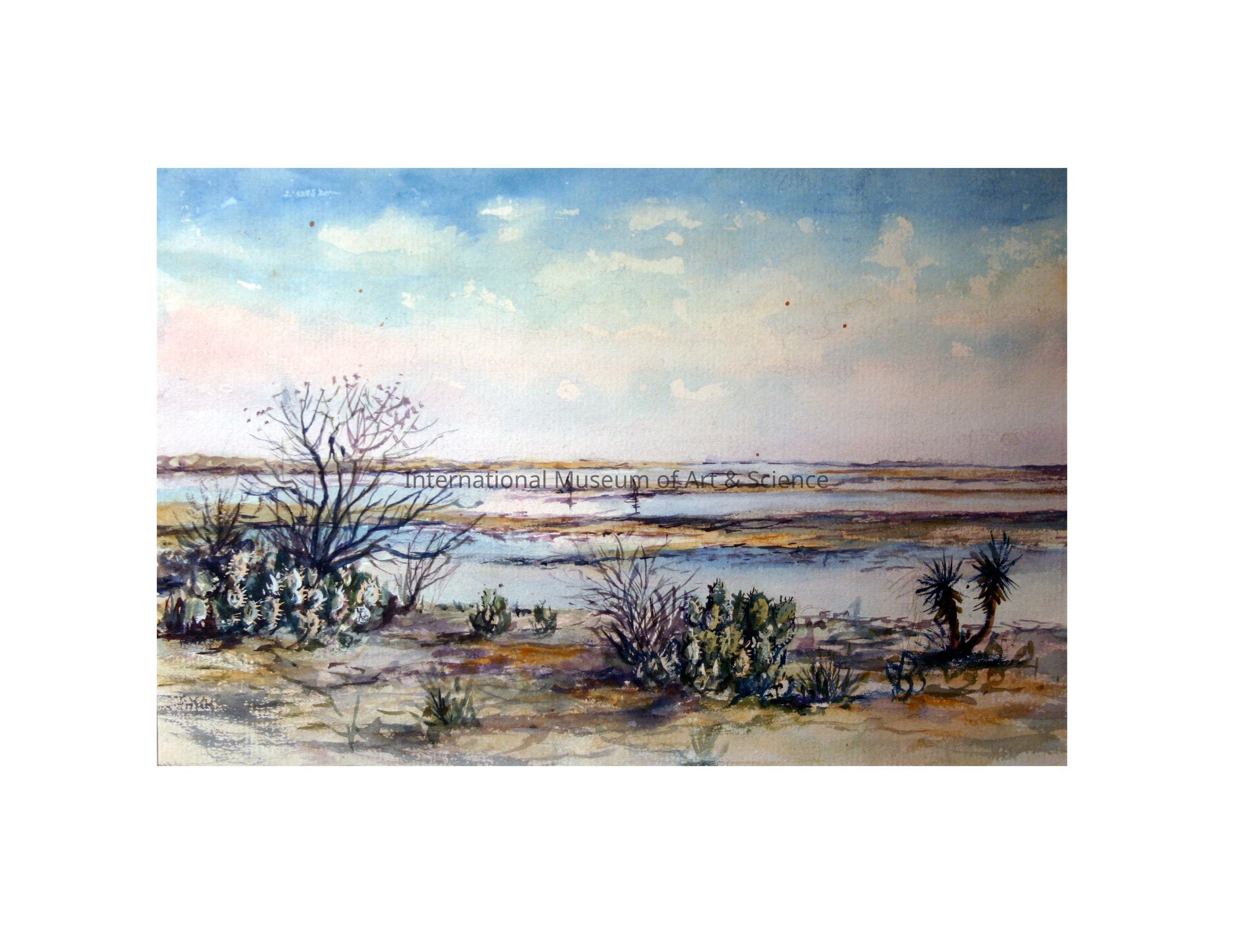 From Red Head Hill. Landscape watercolor painting; desert scenery; colorful view of numerous green cactus plants; bare tree limbs; colorful bare distant land; cloudy skies, daylight scene; miniature twin palm trees.Made/Created