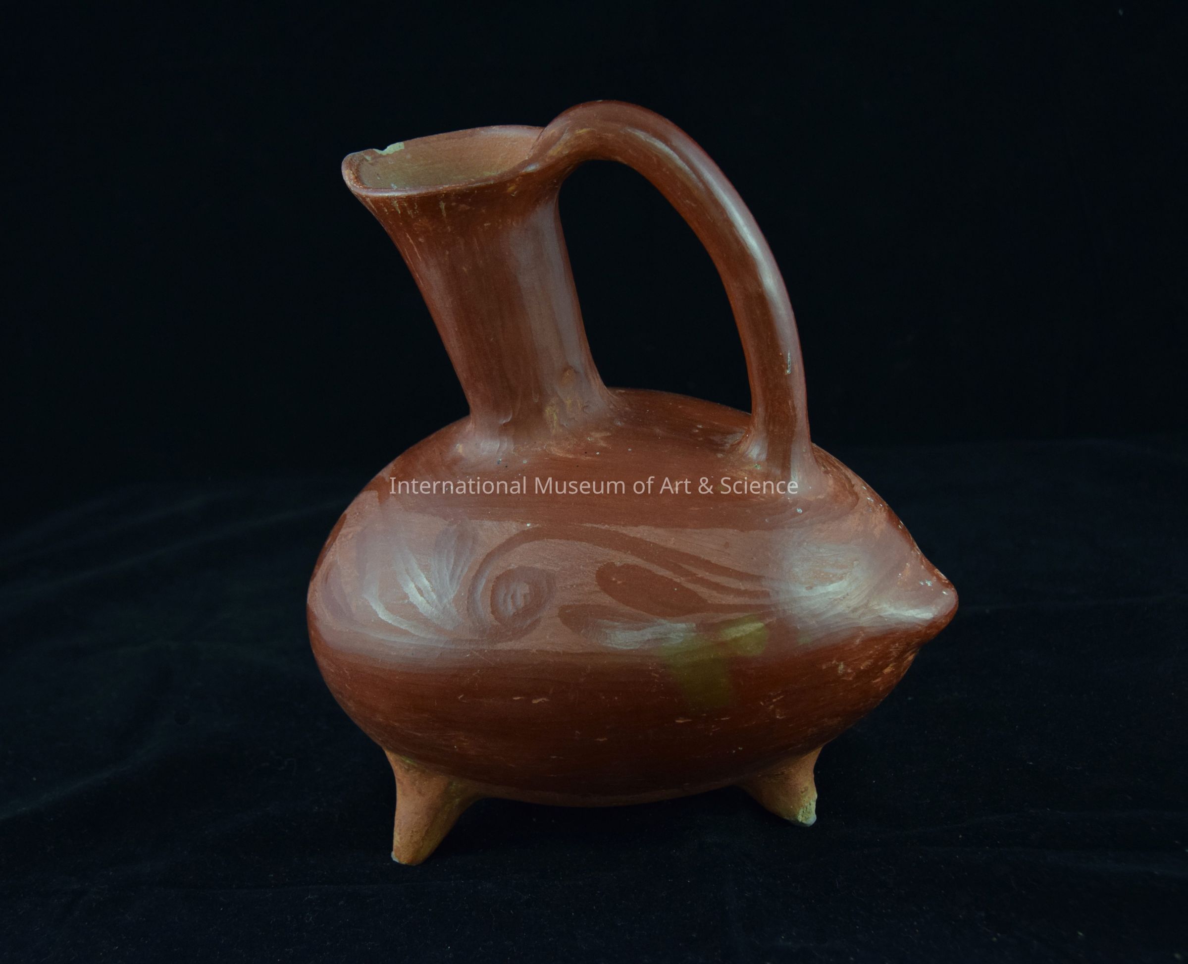Pitcher; burnished, red pottery; three small feet; narrow neck; wide mouth; slender handle; oval-shaped body with small tip under handle.Dimensions