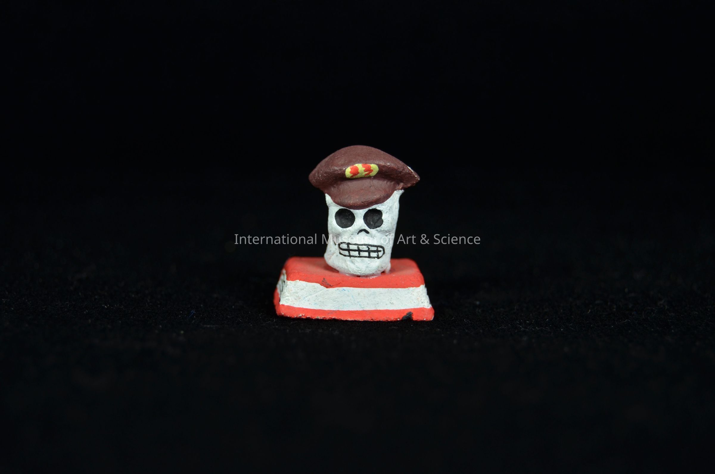A small Day of the Dead figurine. It is a skull on top of red book. The skull-clay is painted white with black eye sockets, and black jaw detail. The skull is wearing a brown cap with the #33 painted on it.Dimensions