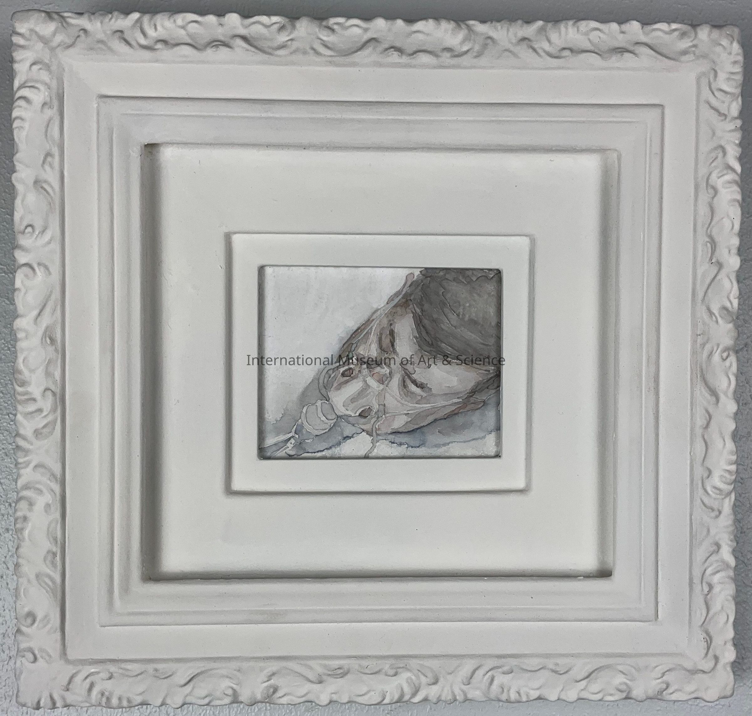 Watercolor painting of individual with a respirator mask. Original frame is flourished and painted white.
