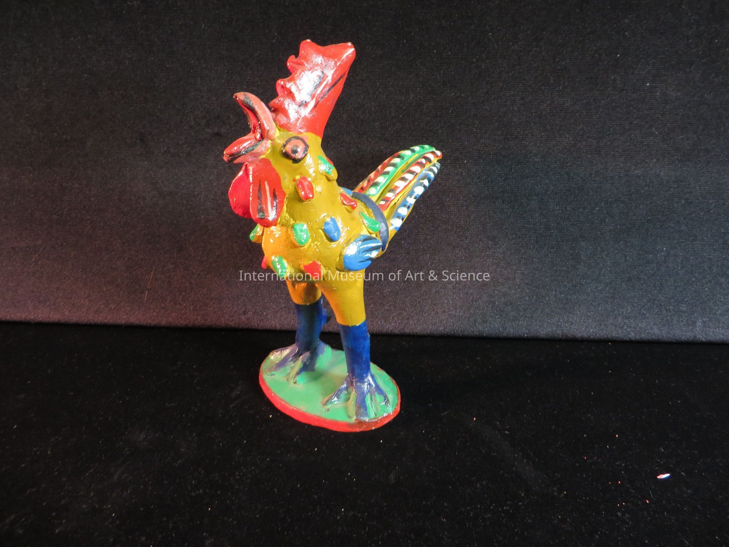 Standing rooster on oval base painted green with rim; red, beak open, red crown and chin; feather of green, red and blue with black and white stripes; blue feet, brown mustard color body with red, green and blue feathers in relief.Made/Created