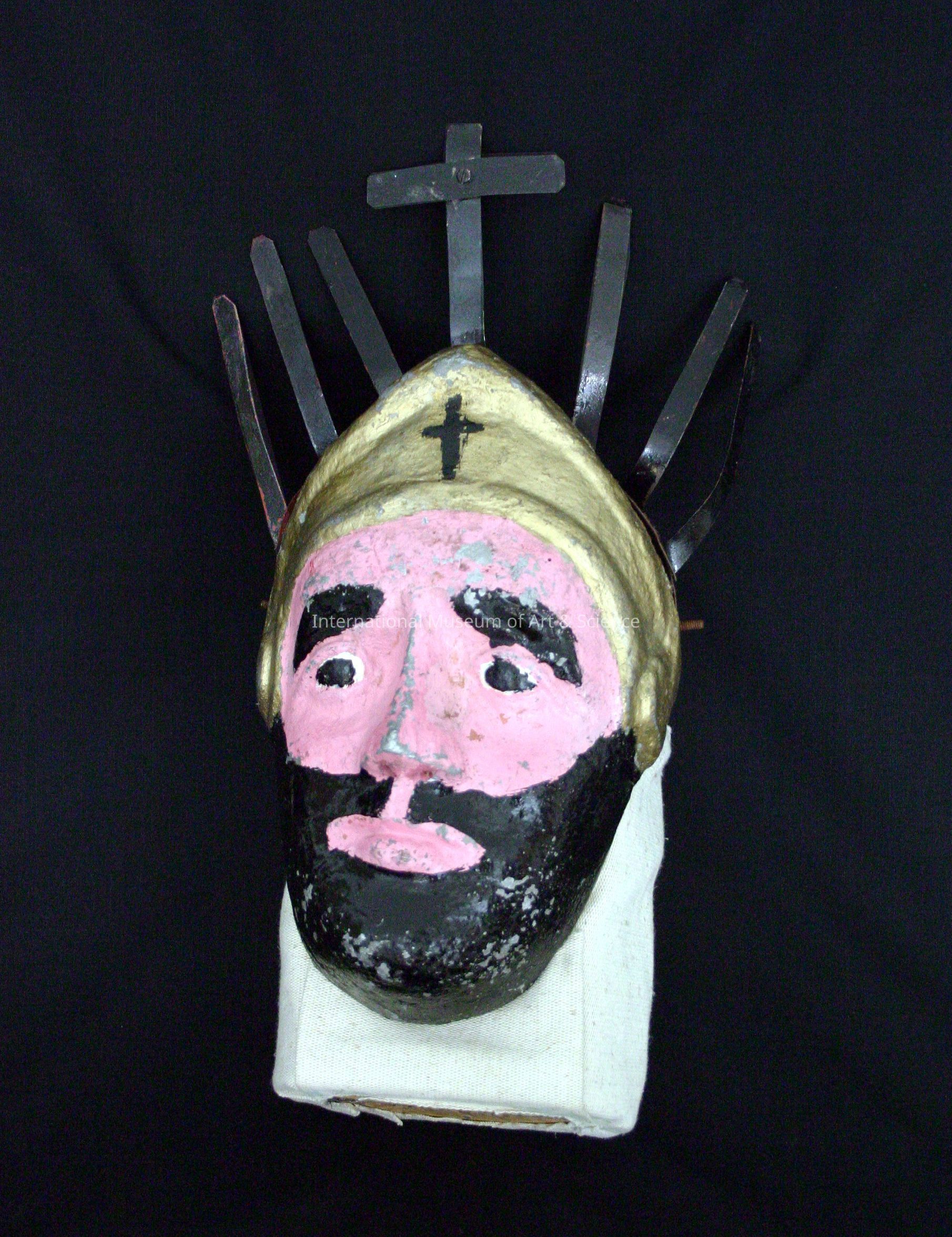 Mask representing the Apostle Saint James; cast lead mask and helmet; tin cross and vertical bars extend above face and helmet; painted pink, black, and gold.