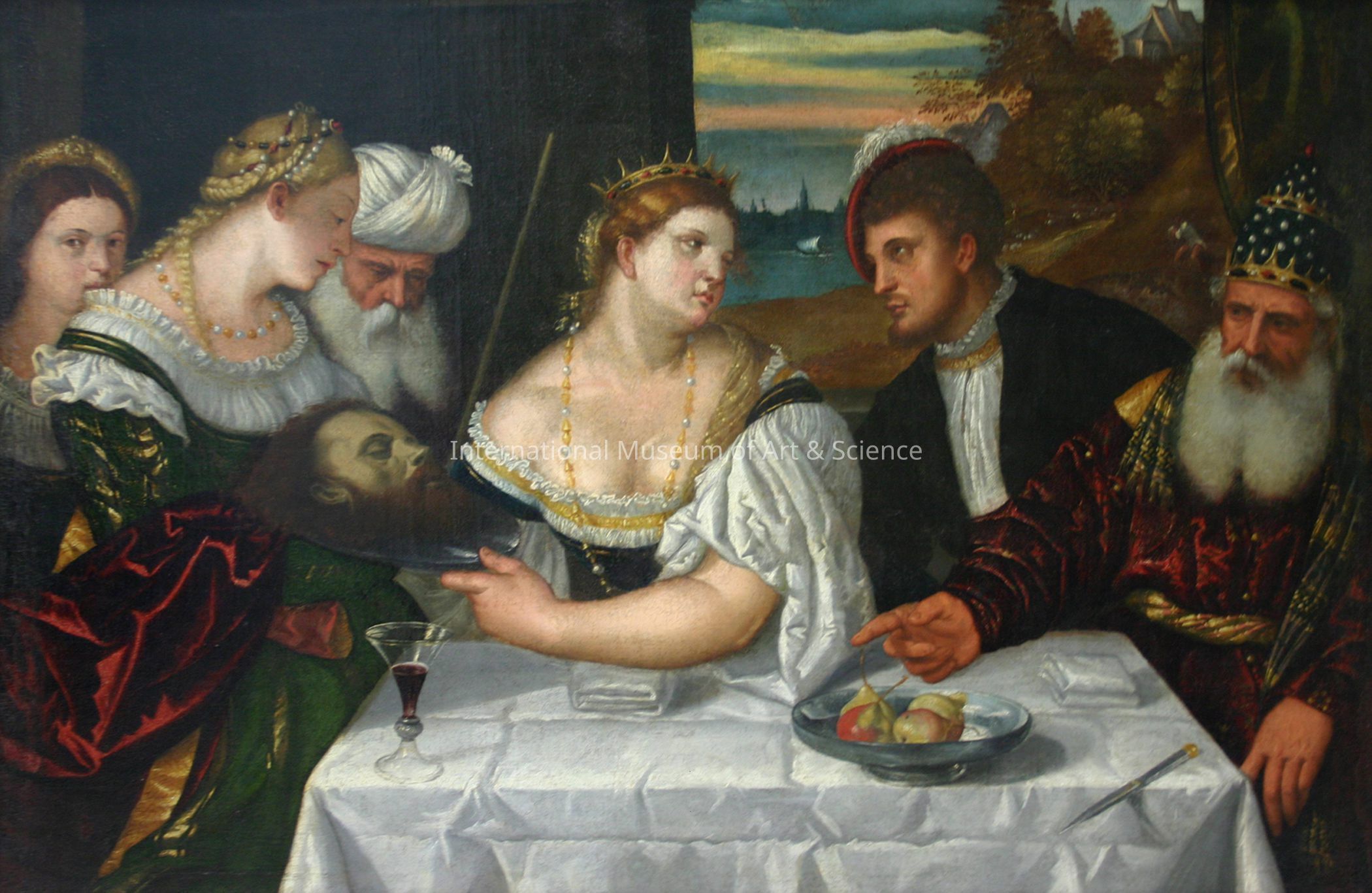 "Salome Given the Head of St. John the Baptist by Herod". Group of six at a table covered in white linen; one of the women is presenting the platter to Salome as she looks behind to the man on her left.Artwork Details