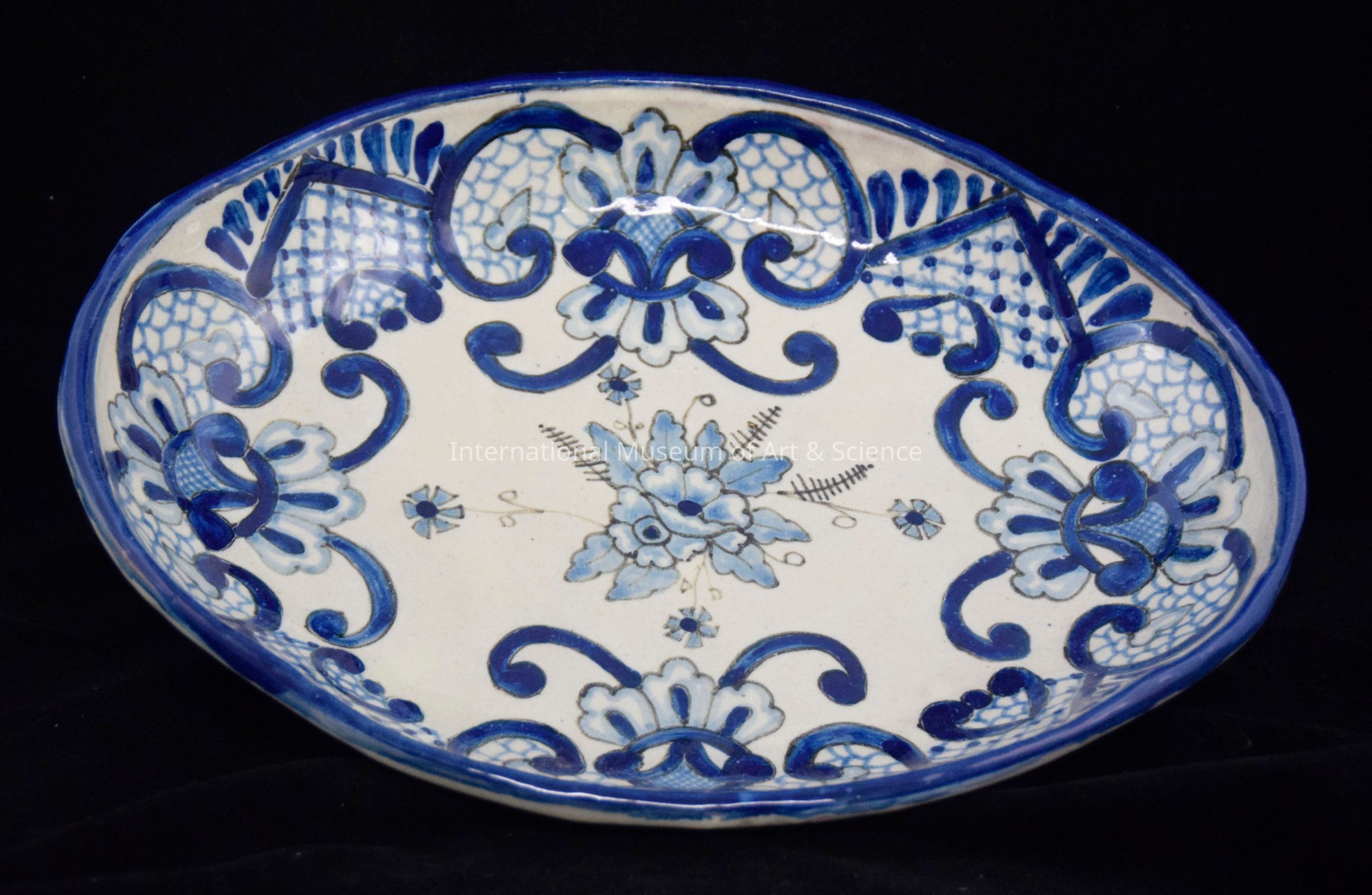 Oval shaped deep platter. Roses in center; Cream with light and dark blue symmetrical pattern.