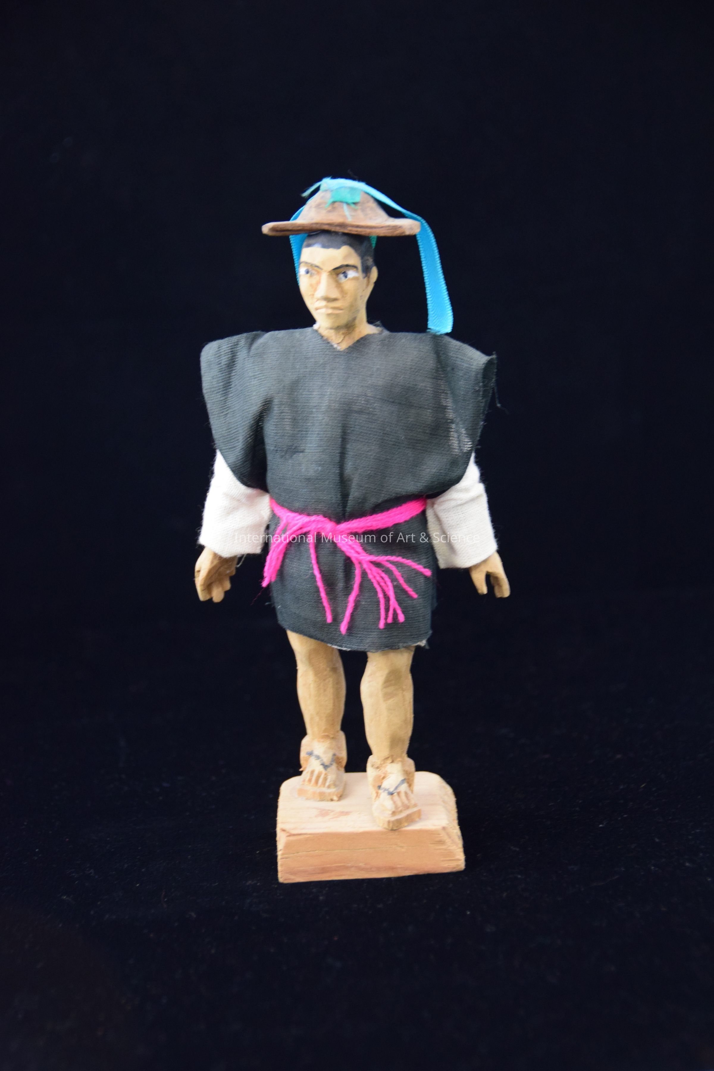 Carved figure of man, wooden hat with blue and green ribbons; white cotton suit, black over-blouse with red yarn belt; sandals carved on feet; base of light-colored wood.Dimensions