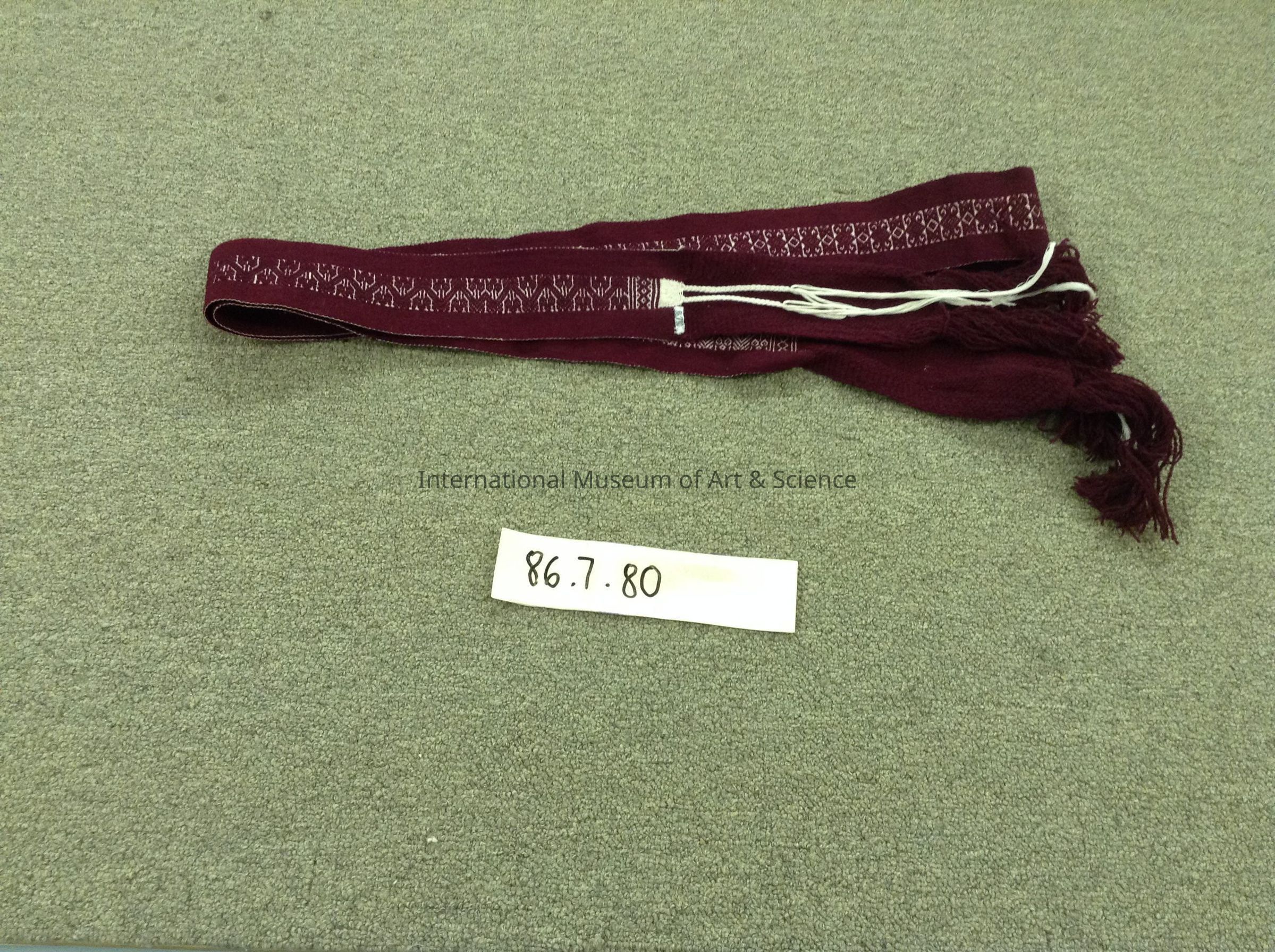 Belt. Maroon with white fringe, 2 bands of maroon sandwiching one band of white and maroon, geometric pattern; ends; maroon finished with 2 tassels, white finished with 2 slim braids.Artwork Details