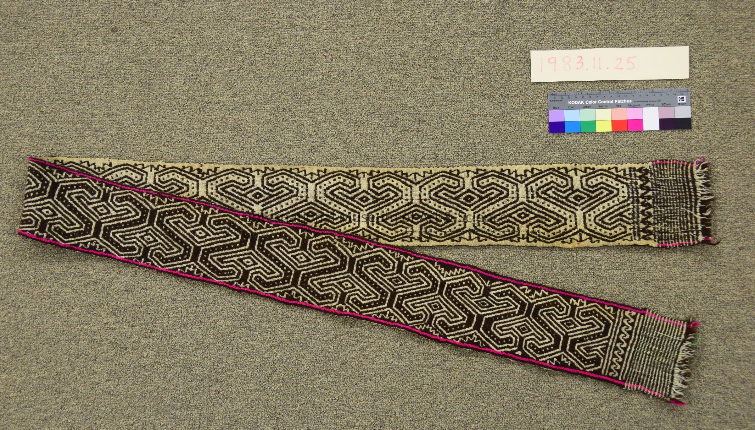 Huichol belt/sash. A 4.5’’ wide double-weave belt in wool with a geometric pattern in beige and dark brown. The design appears in inverted colors on each side. On the belt’s face are two vibrant pink lines that decorate its two lengthwise edges. The belt’s ends have thin beige and brown stripes and are fringed. Most likely a men’s ‘juayame’ belt. The repeating motif might represent the leaves and flowers of the maguey. See notes for more information.Dimensions