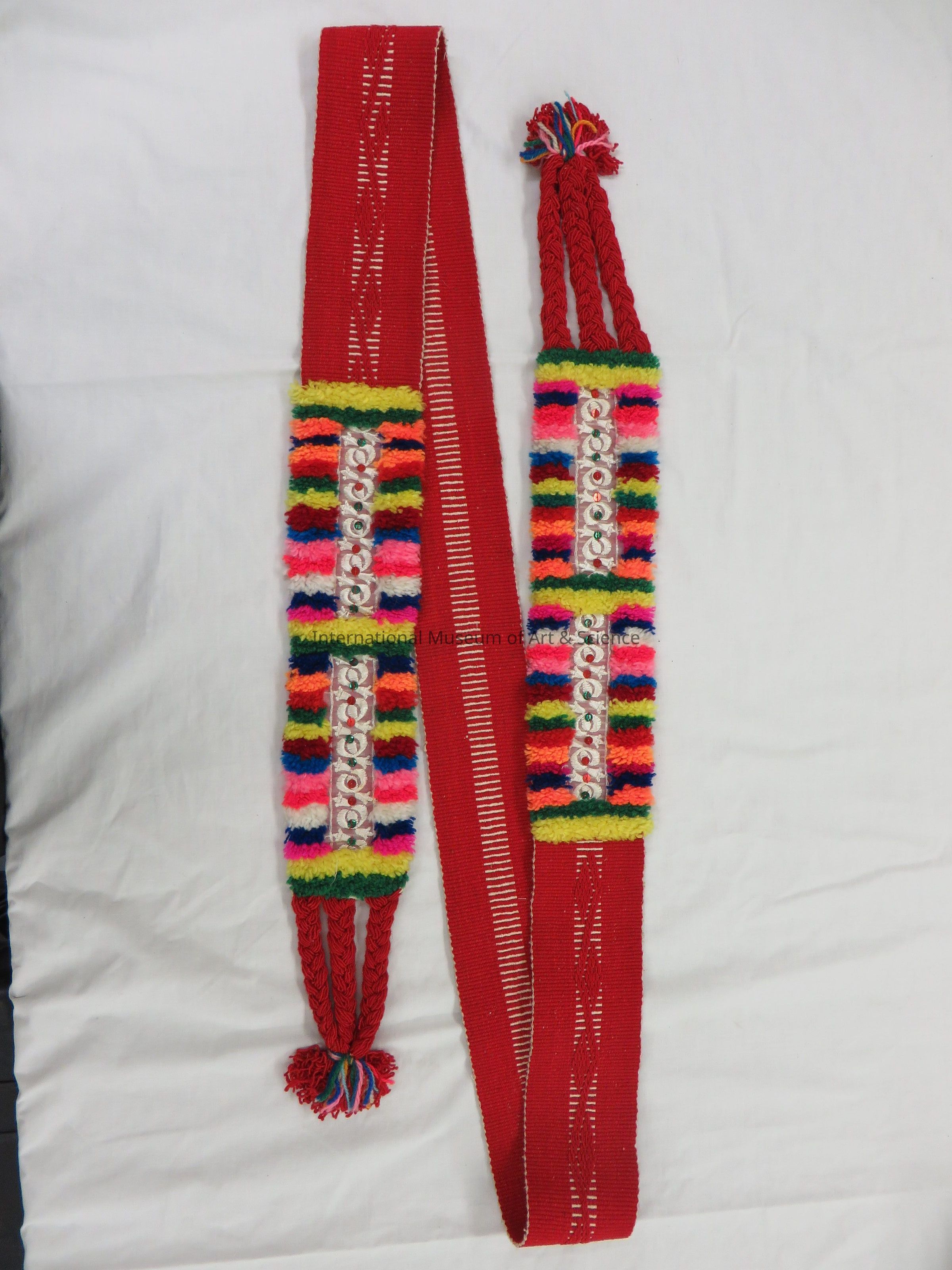 Belt. Red banded belt; center red and white design deocrated at both ends with horizontal bands of green, orange, blue, red, pink, brown, purple and white yarn; machine made lace and sequins at center, braided tassels tied with colored yarn at ends.Artwork Details