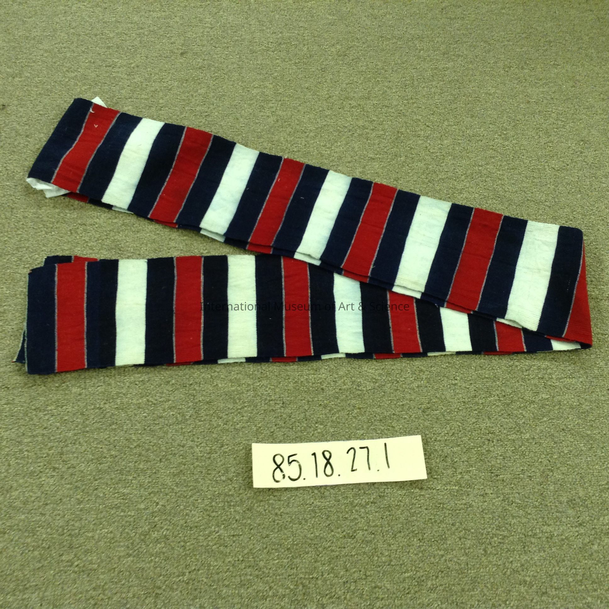 Man's belt. Wide vertical bands; weft-faced; sequence of blue, red, blue, white strips.