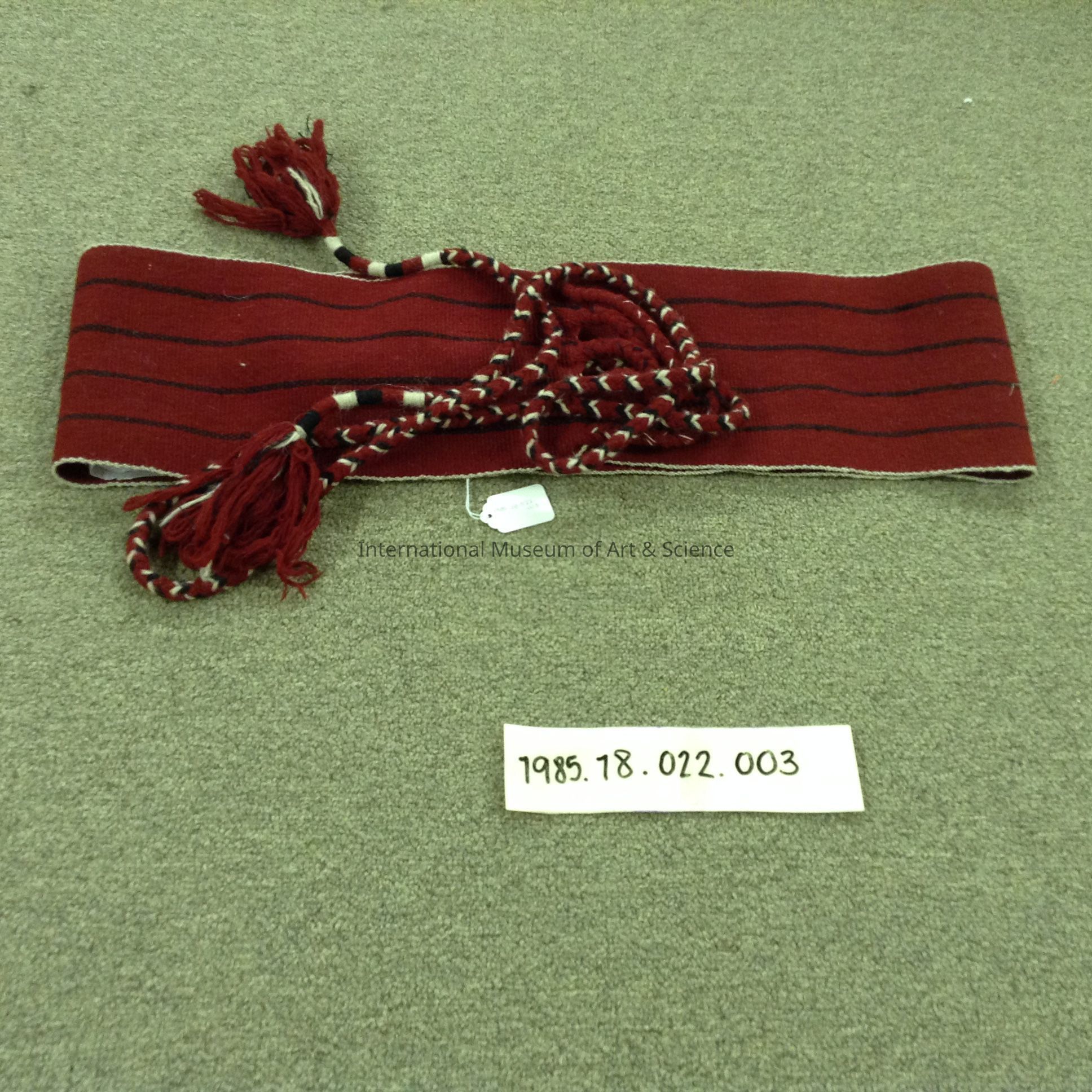 Belt. Long and wide maroon wool belt; black woven horizontal bands; white edge finish braided ends for tieing.