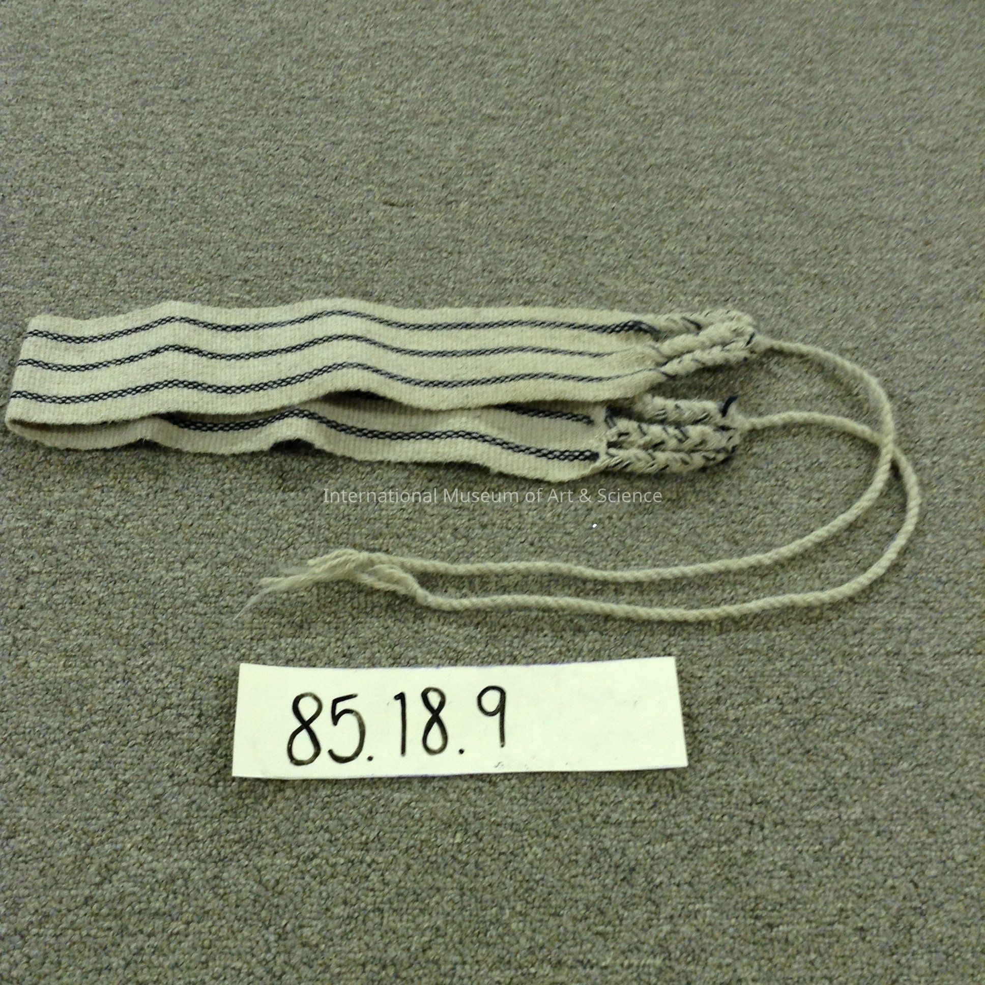 A naturally light beige woven wool belt. The belt has black woven horizontal bands. the ends are braided for tying.Dimensions