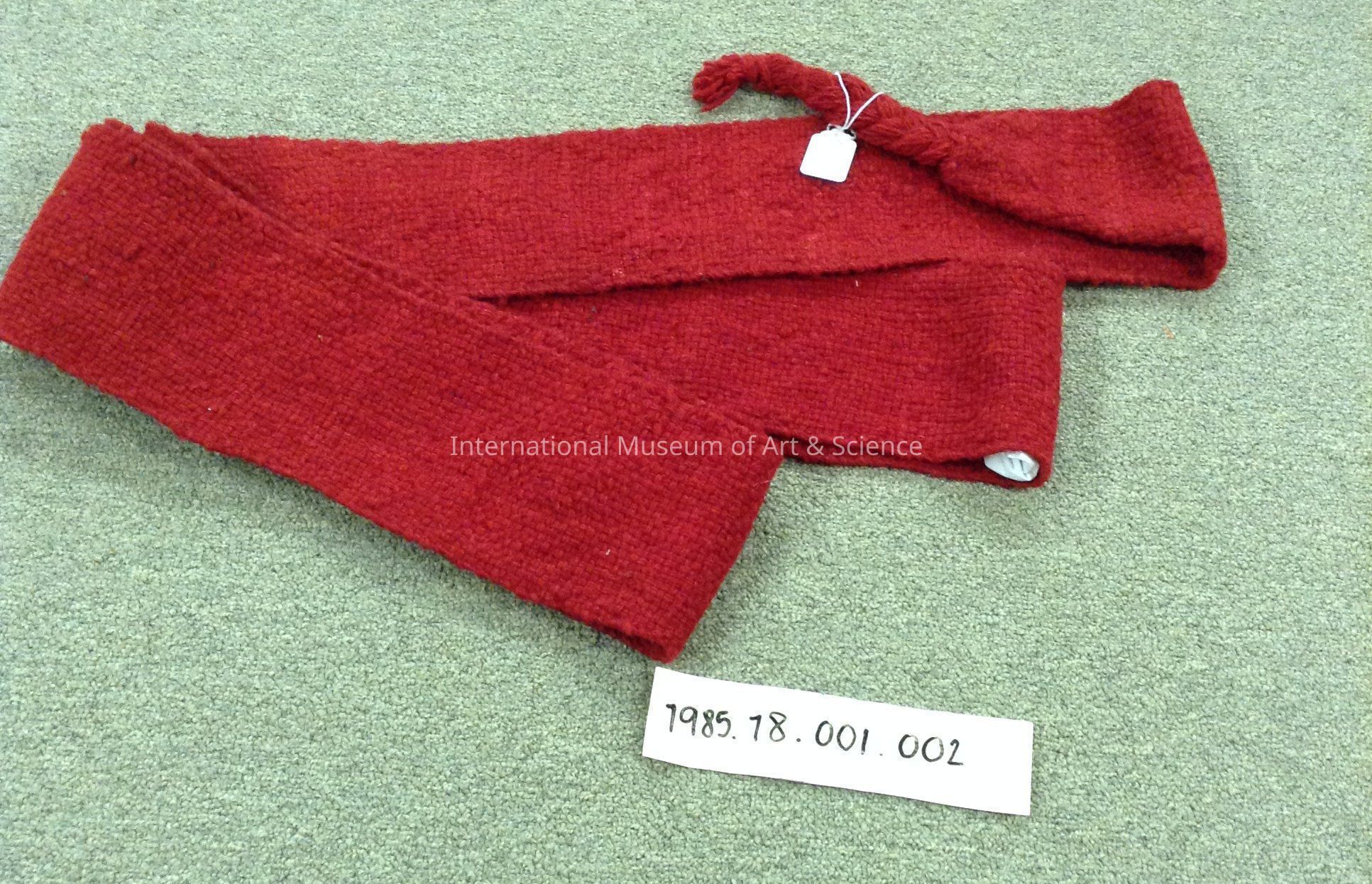 Long wide belt; overall dark red woven wool belt; braided end.