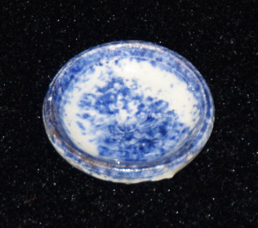 Miniature saucer. Clay, ceramic blue "sponge" glaze on exterior, siny on interior and matte white on bottom.Made/Created