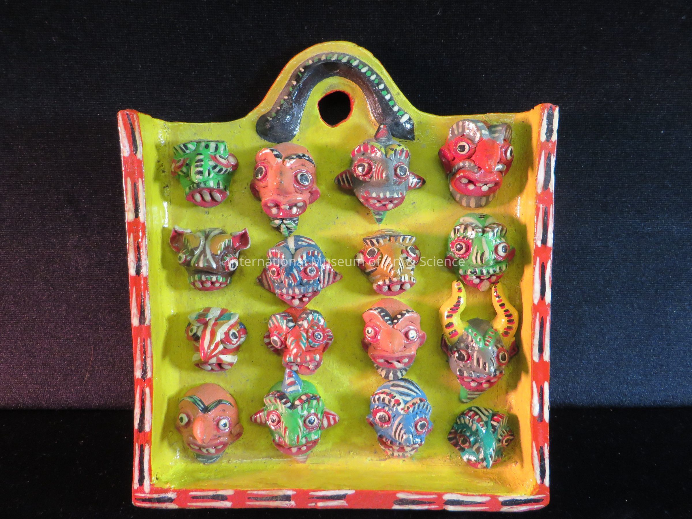 "Wall plaque of miniature masks". The interior of the plaque is painted yellow, the exterior is painted light blue and orange with black and white stripes. There are sixteen miniature masks attached. The masks are painted with devil and ugly creature features.Artwork Details