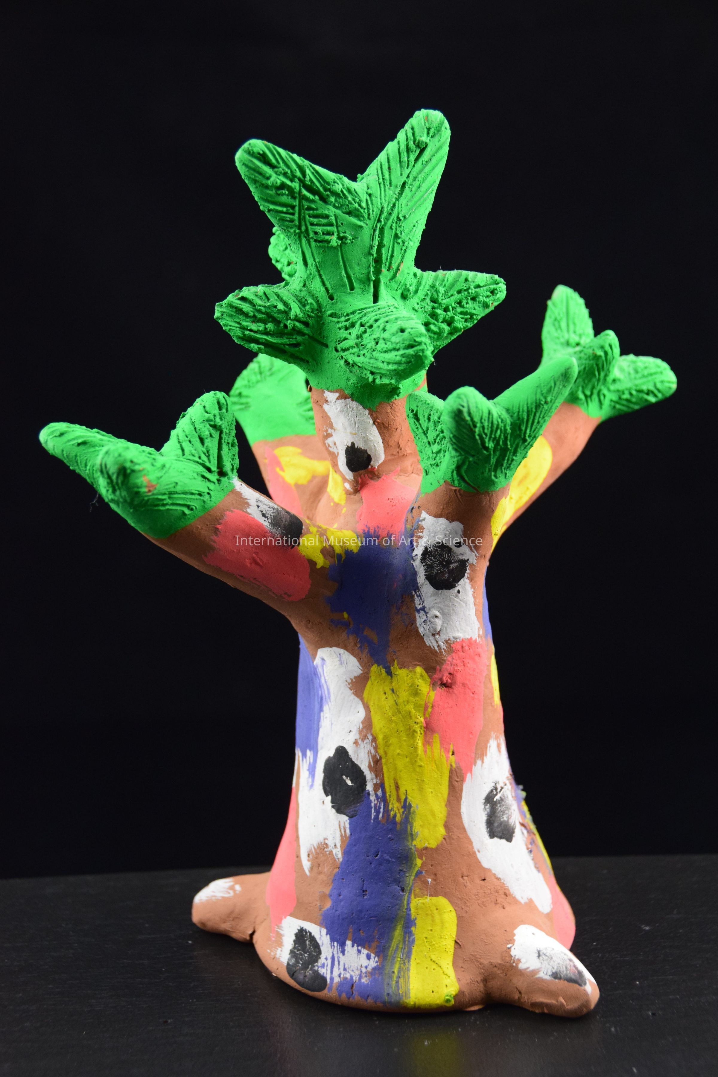 Clay palm tree figurine. It is a light brown multicolored palm tree. It is part of a set of 12 clay palm trees.