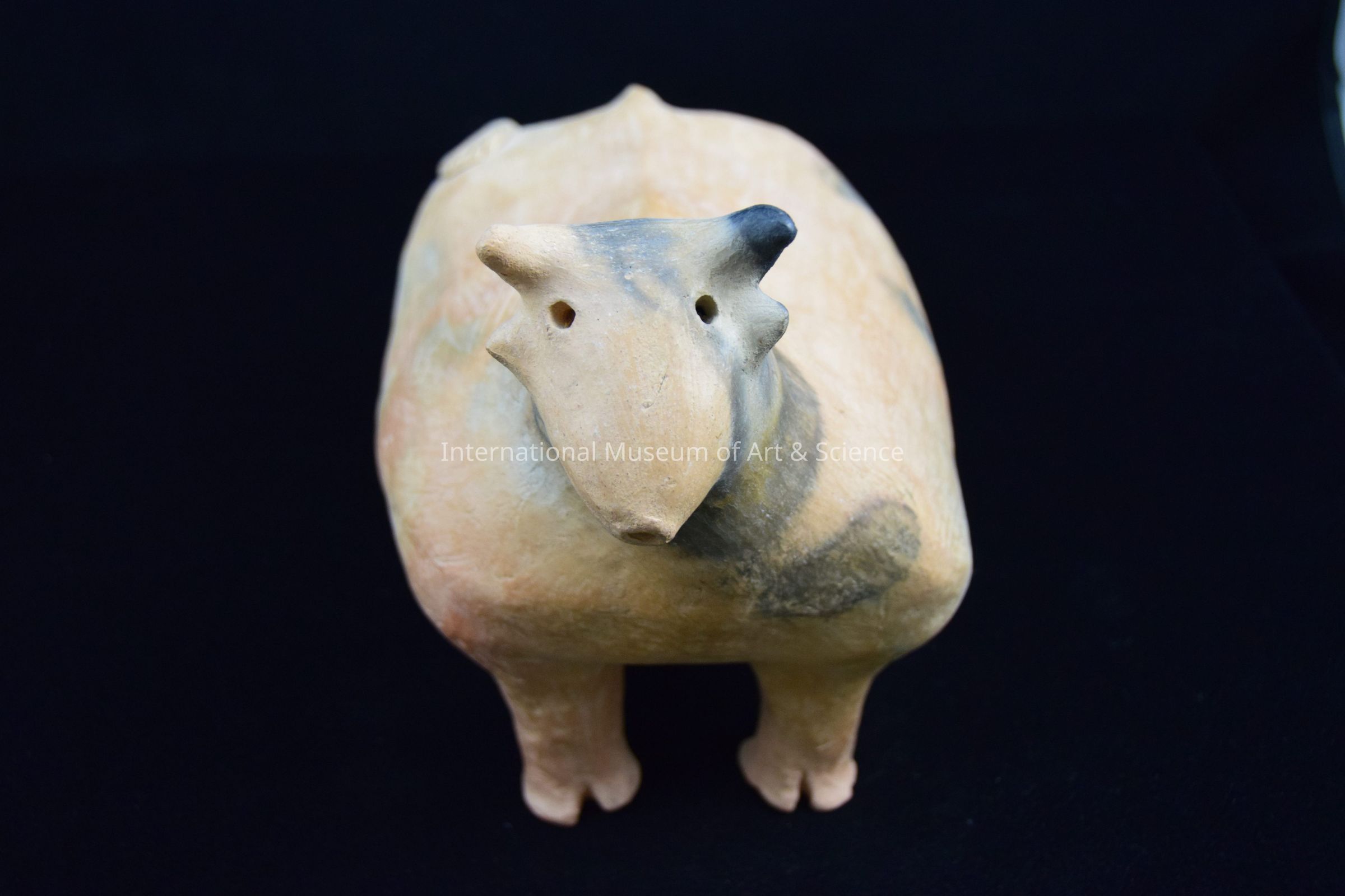 A ceramic sculpture of a bull. The bull is stocky and is a natural beige clay color with touches of black. It has a curled tail, short horns, and bif hooves. There is an opening underneath the bull on its stomach, that may indicate it is possible a bank.Dimensions