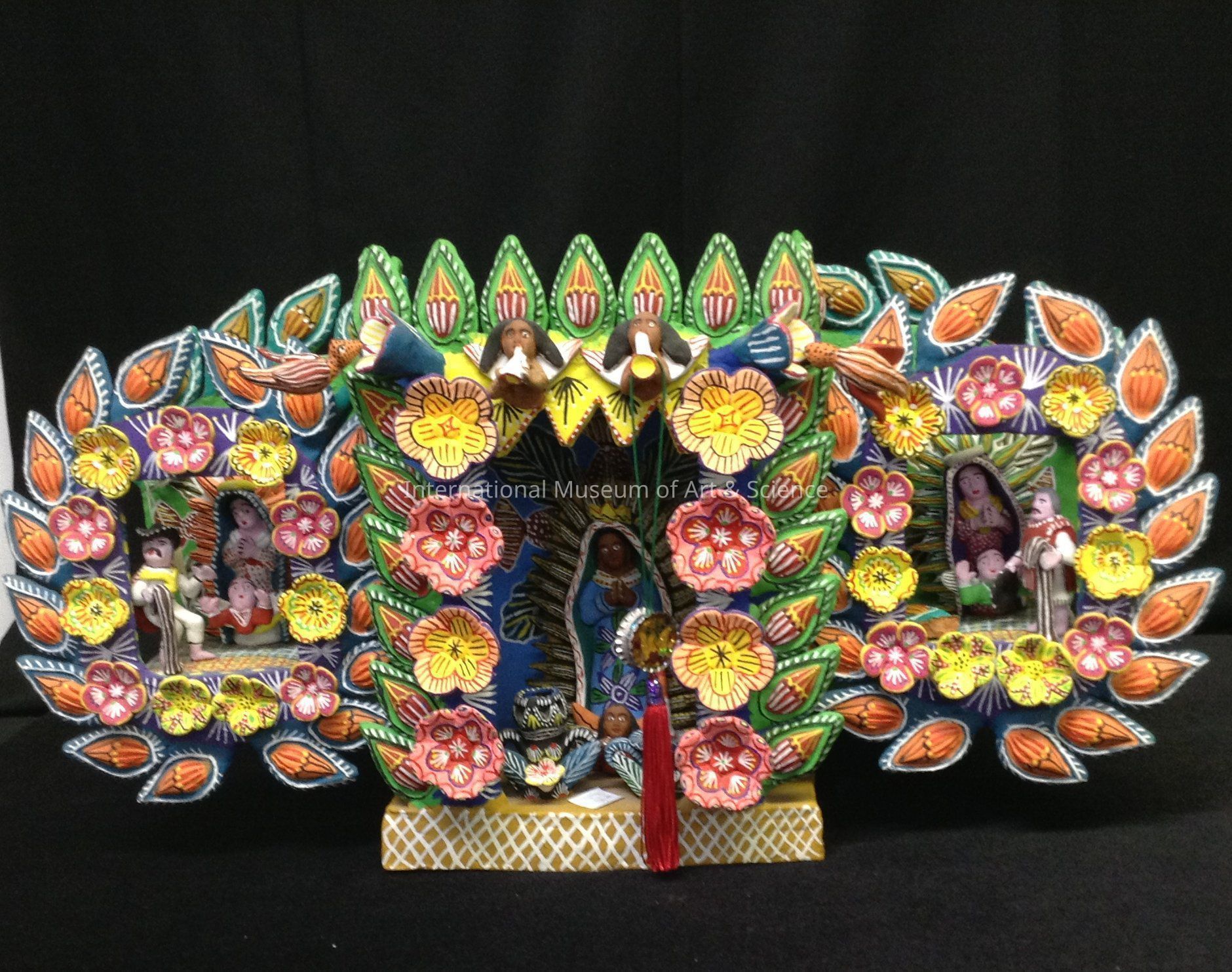 Three scene assemblage altar triptic with three guadalupes; Hummingbirds. Trumpeting angels. Altars framed in flowers and leaves. Ceramic. A Large wooden guadalupe with a red devil climbing the side of her is part of the piece as well as an Elvis guardian angel bottlecap tassle with red strings. Small wooden box holds yellow toothpicks that are inserted into the wooden figurine.Artwork Details
