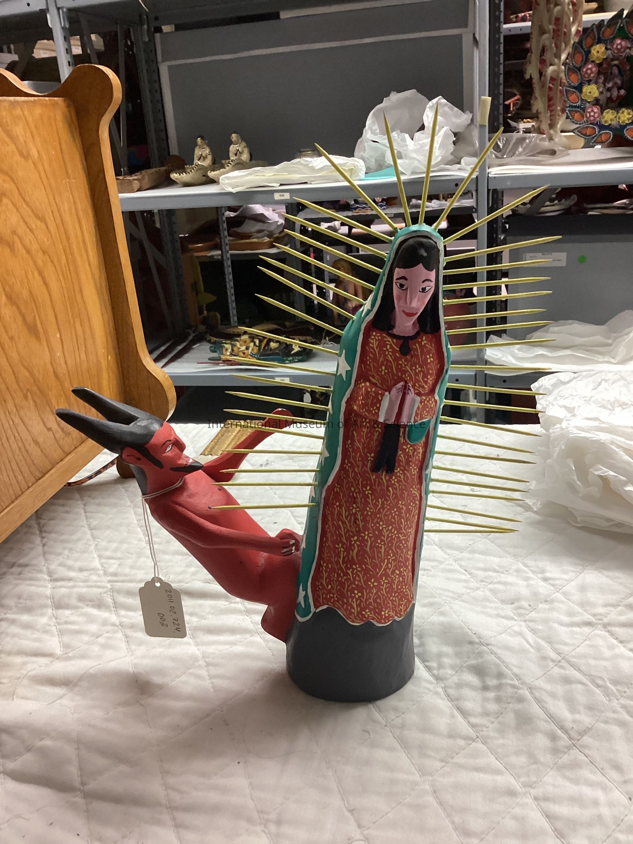 Wooden virgin placed at the top of the clay triptic. The Virgin has a pink face, red cheeks, dark hair, turquoise mantle with big white stars on it; virgin has yellow toothpicks creating a halo around the body; a red devil is placed on the left, kneeling down at the virgin.Artwork Details