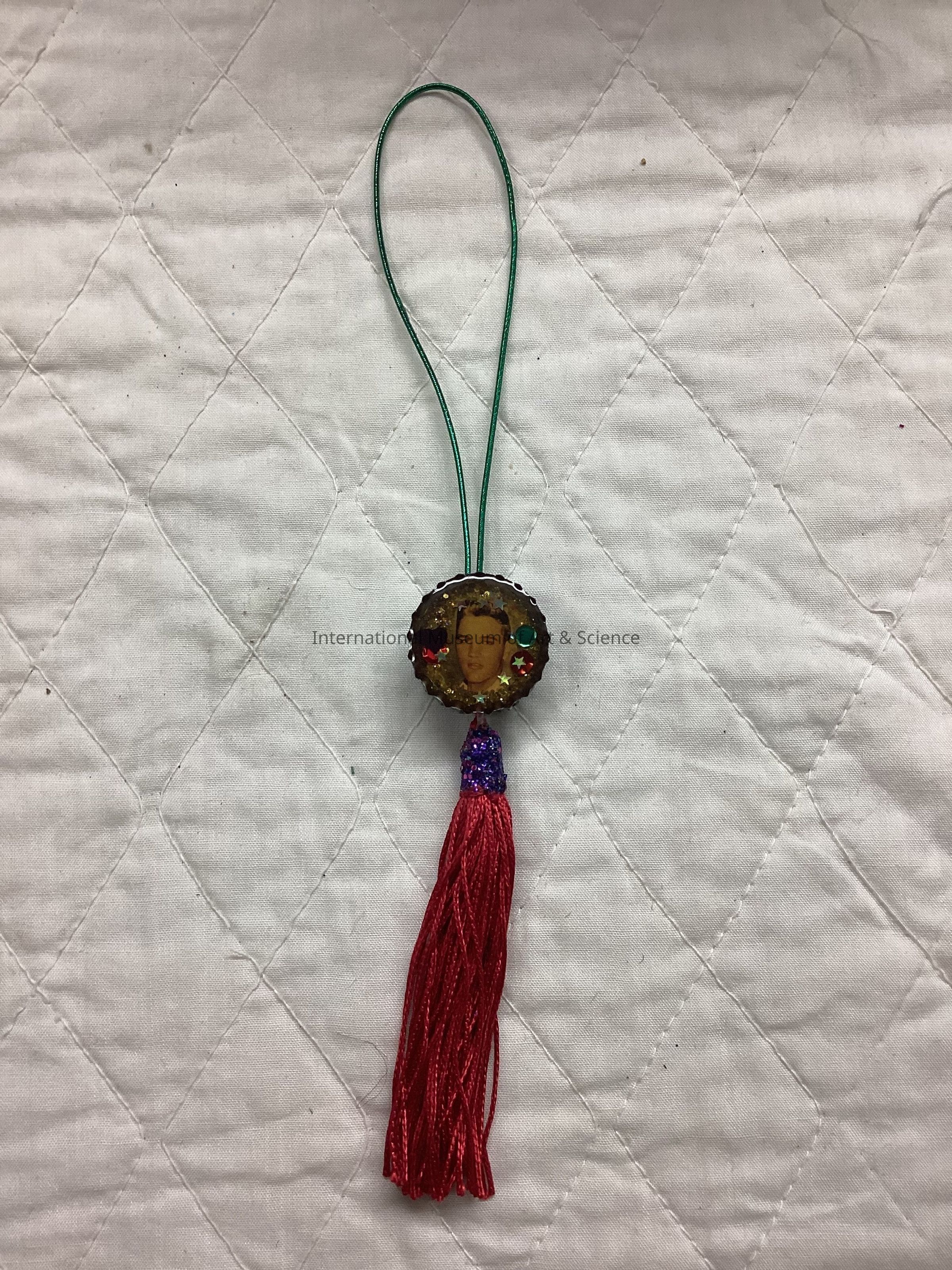 "Guardian Angel Elvis" in adorned bottle caps sealed with resin hanging from tassel.