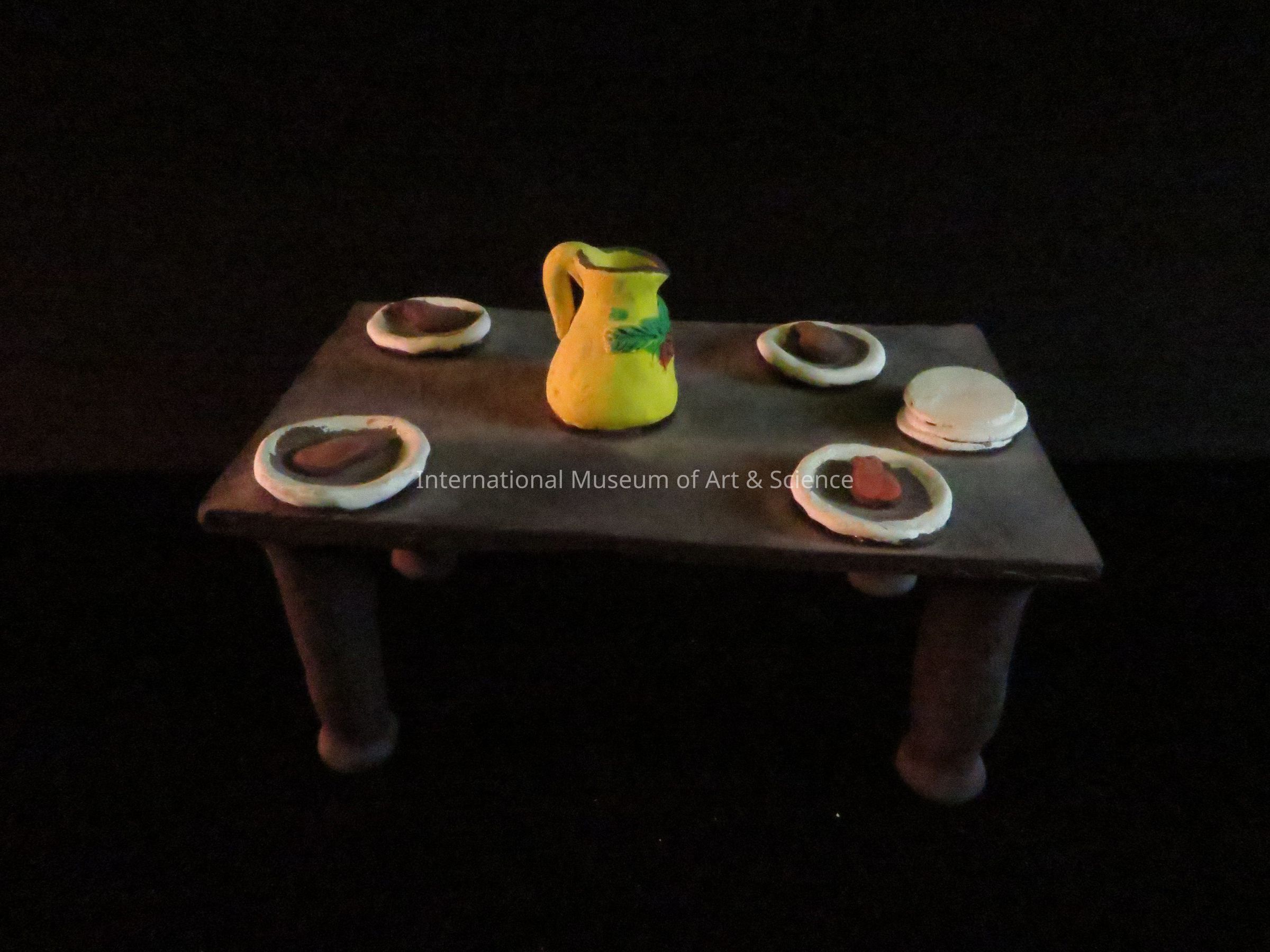 Table, painted dark purple. Four plates with food painted brown and orange have been placed on each corner of the table top. Three white tortillas are placed on each corner of the table top. Three white tortillas are placed on one end. A yellow pitcher is on the center of the table. This piece is part of 40 piece wedding scene by Josefina Aguilar, painted bisque clay figurines.Dimensions