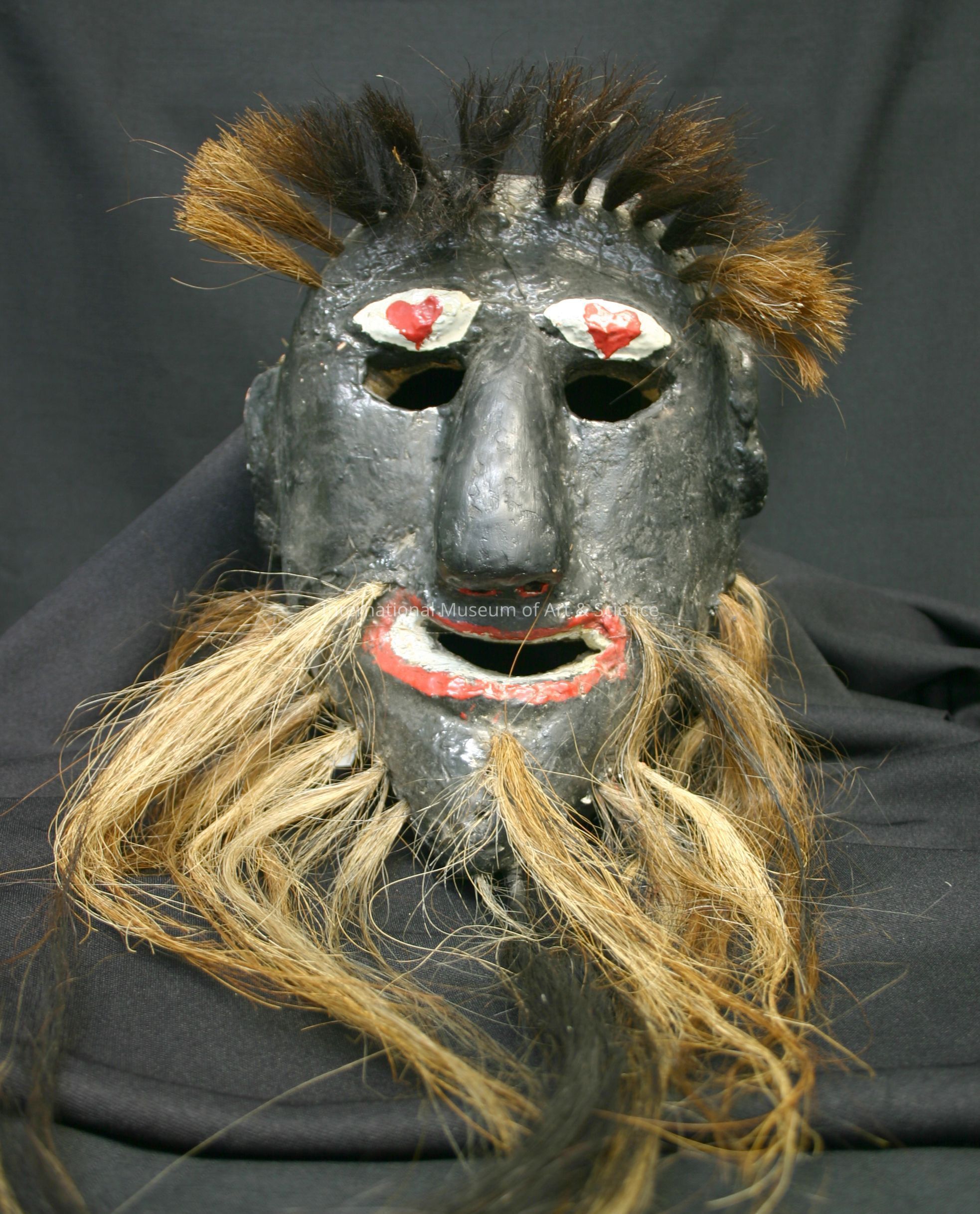 Semana Santa mask. Overall black lacquered mask; brown and black animal hair on forehead, face, and beard; white painted oval eyebrows with red central hearts; red carved open mouth; long nose; round ears.Artwork Details