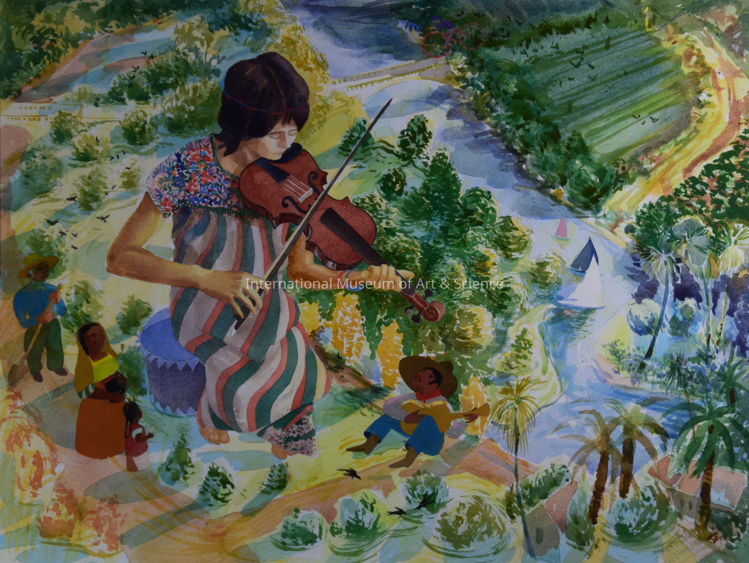 "Serenading the Rio" by E.E. Nichols. The painting depicts the Rio Grande river with a woman playing a violin and other people gathered around watching. The piece is done in bright watercolors.Artwork Details