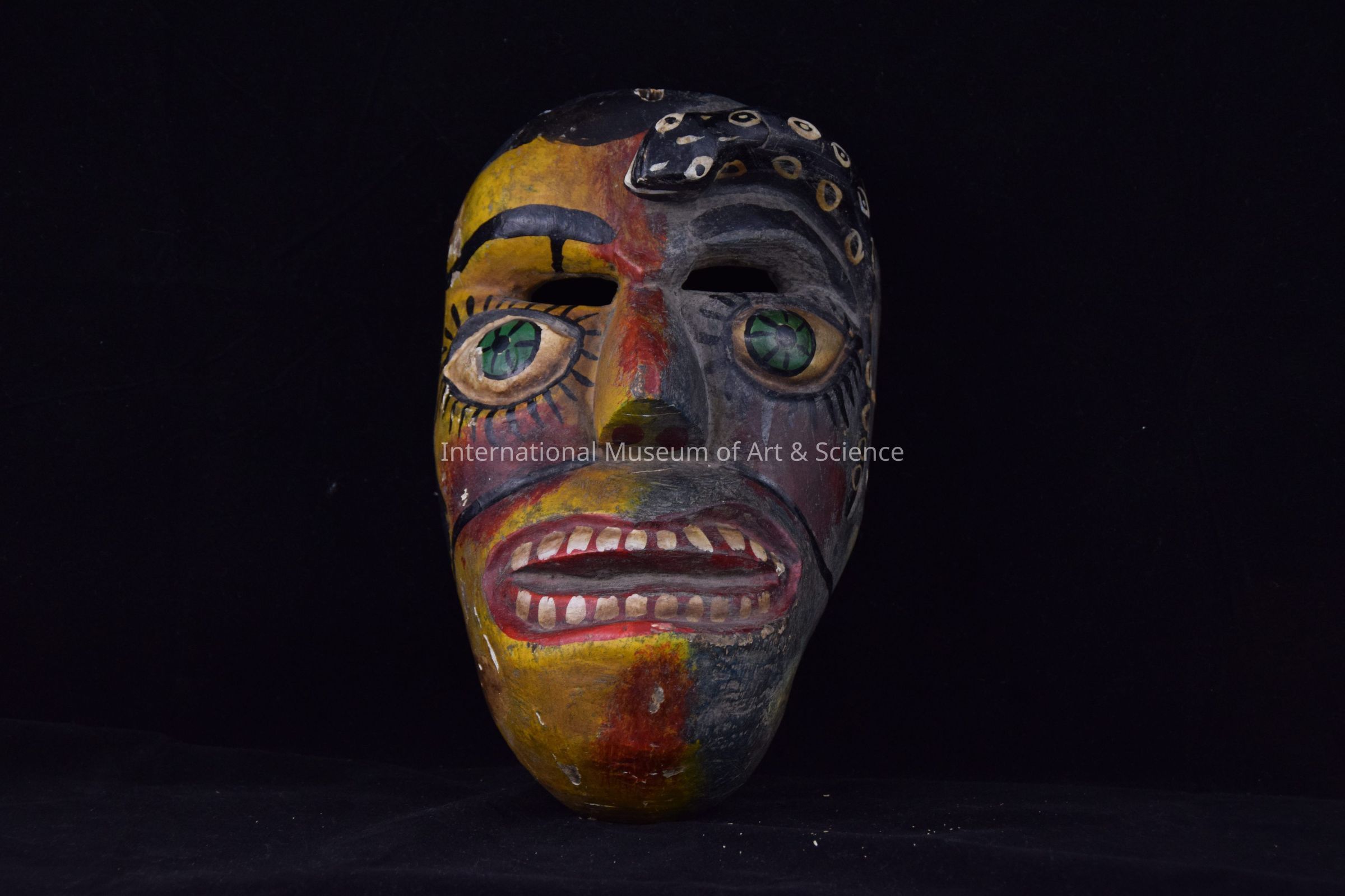 Carved mask. Face painted red, blue yellow, black; Large green eyes. Black snake with white markings right side of forehead.Dimensions