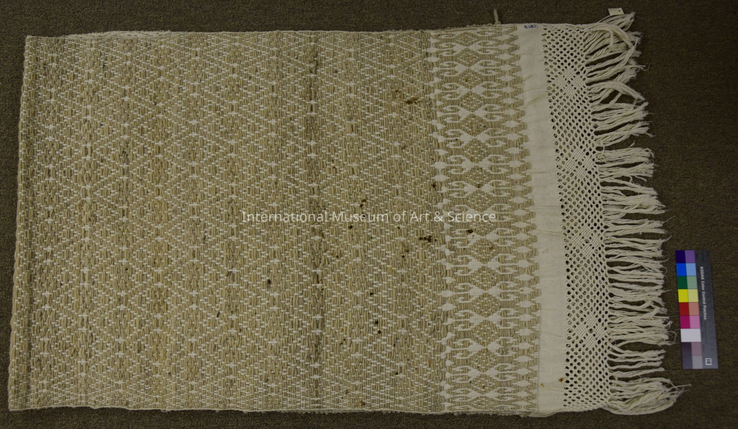 Hand woven rectangular piece. It has a plain-ground weave in ivory cotton thread, and a supplementary weft wool yarn that is thicker and cream-colored. It has diamond patterns throughout and a crochet-like edge with fringe on two ends.Artwork Details