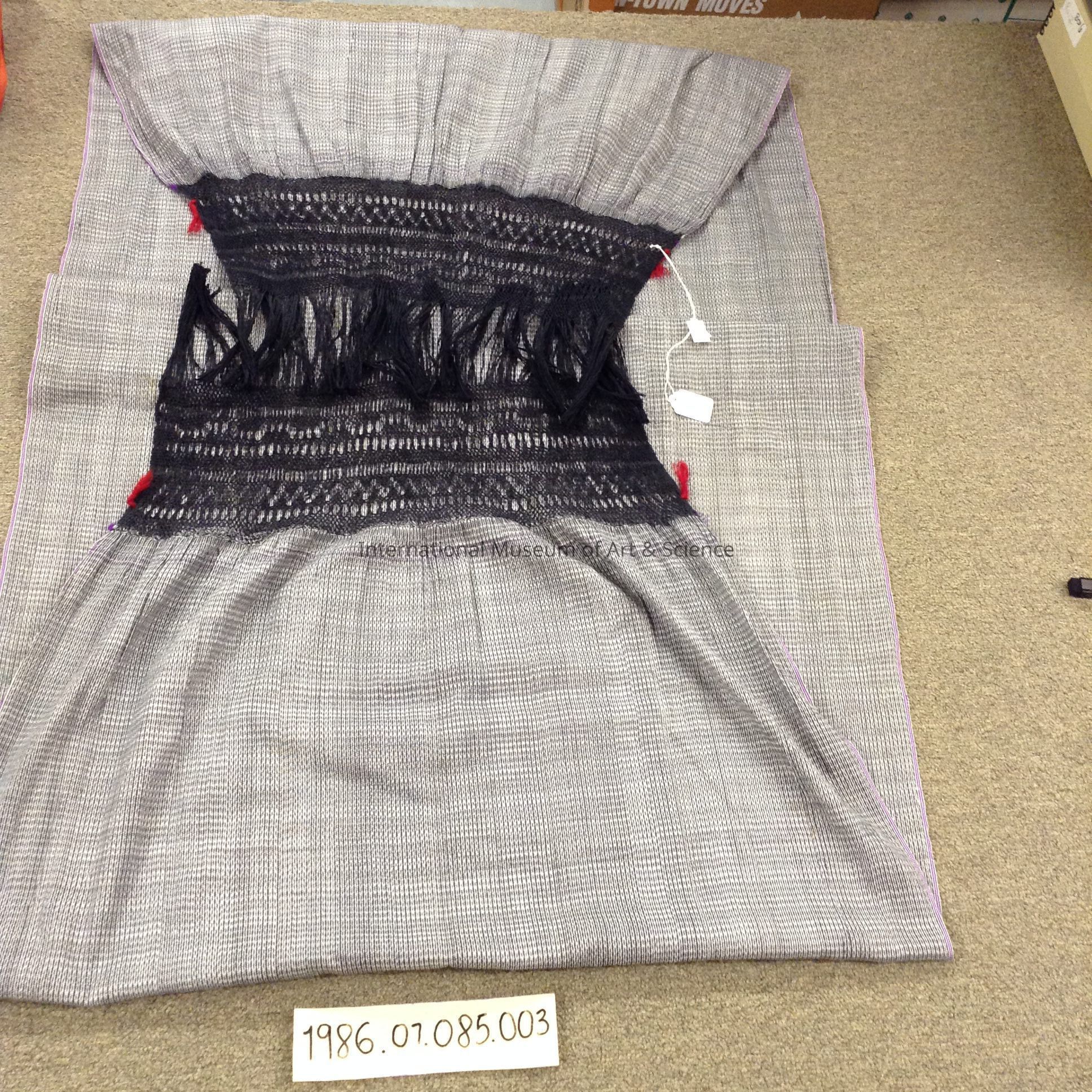 Shawl. Angahuan, Michoacan. Juana Toral Reta. Tarascan. Cotton thread. Black/ white stripes; two stripes of purple along edges; black woven tassels.