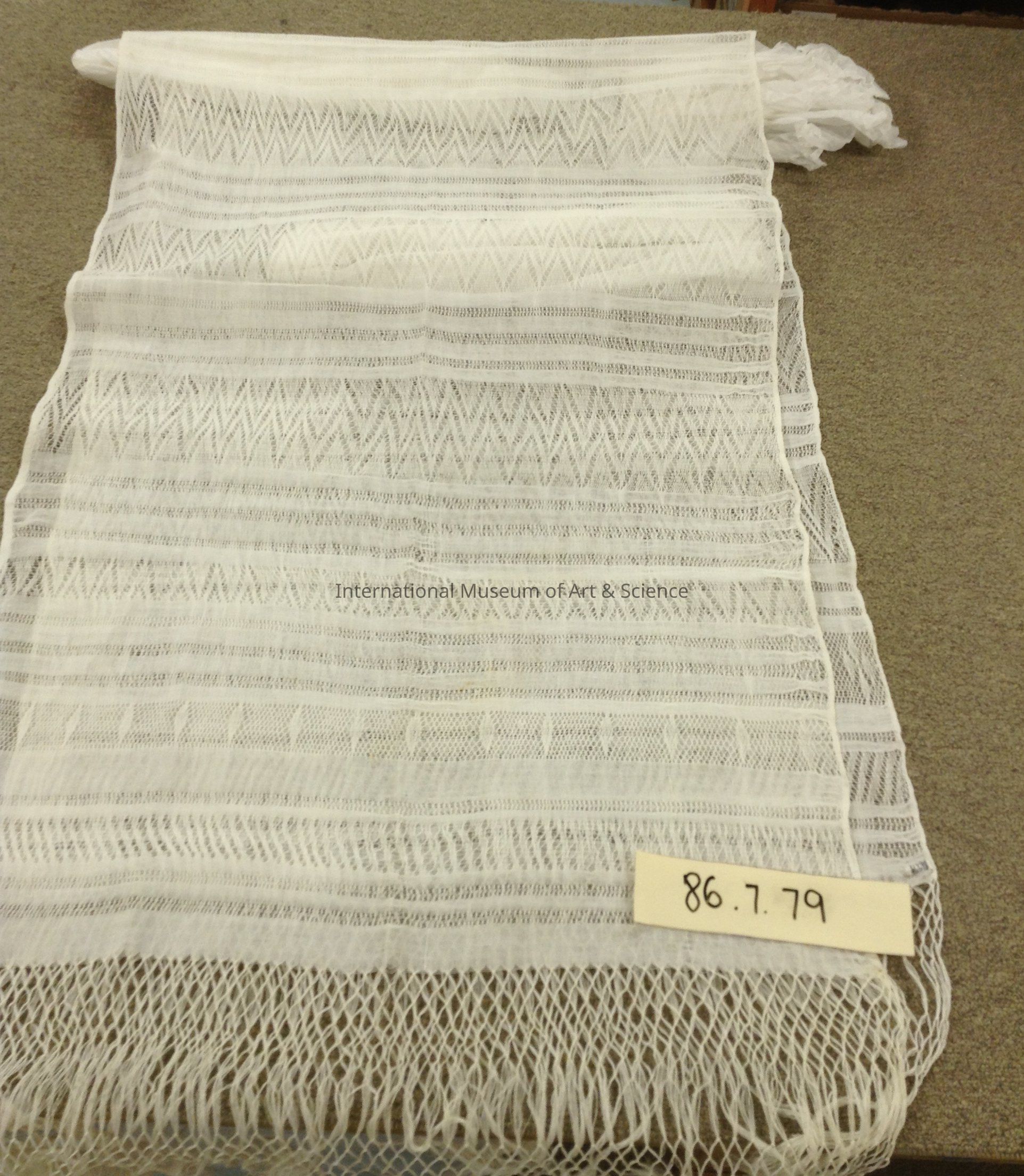 Rebozo. All white, starched?, bands of intricate lace weaving finished in knotted tassels.