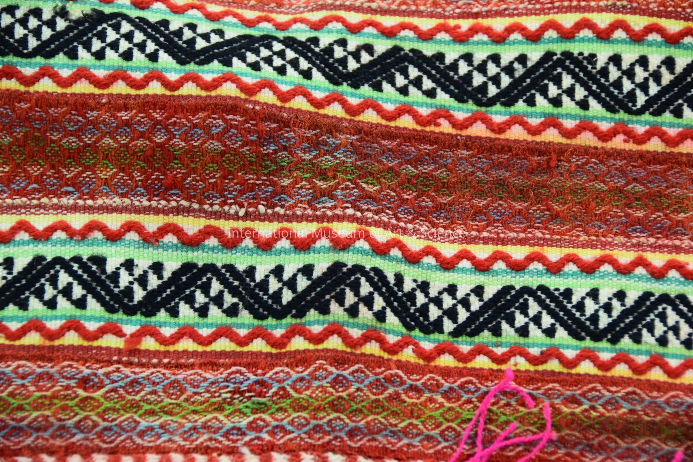 A small sarapes or shawl. The piece is woven from brightly colored wool yarns. There are multiple geometric designs woven into the piece.